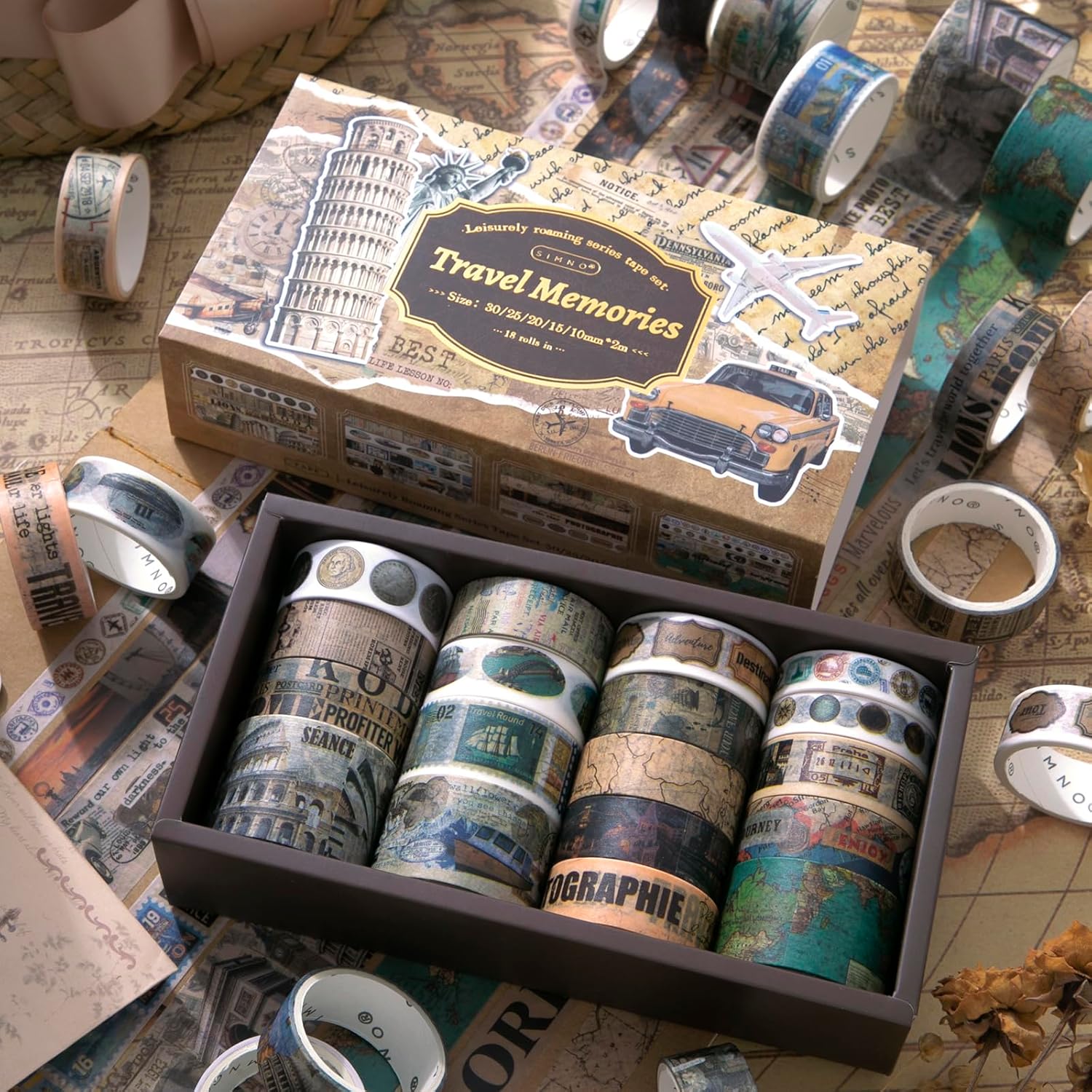 - Travel washi tape comes in a pretty box. This washi tape adds a special touch and travel theme to your creations. It's a great gift for friends and students who love crafts.