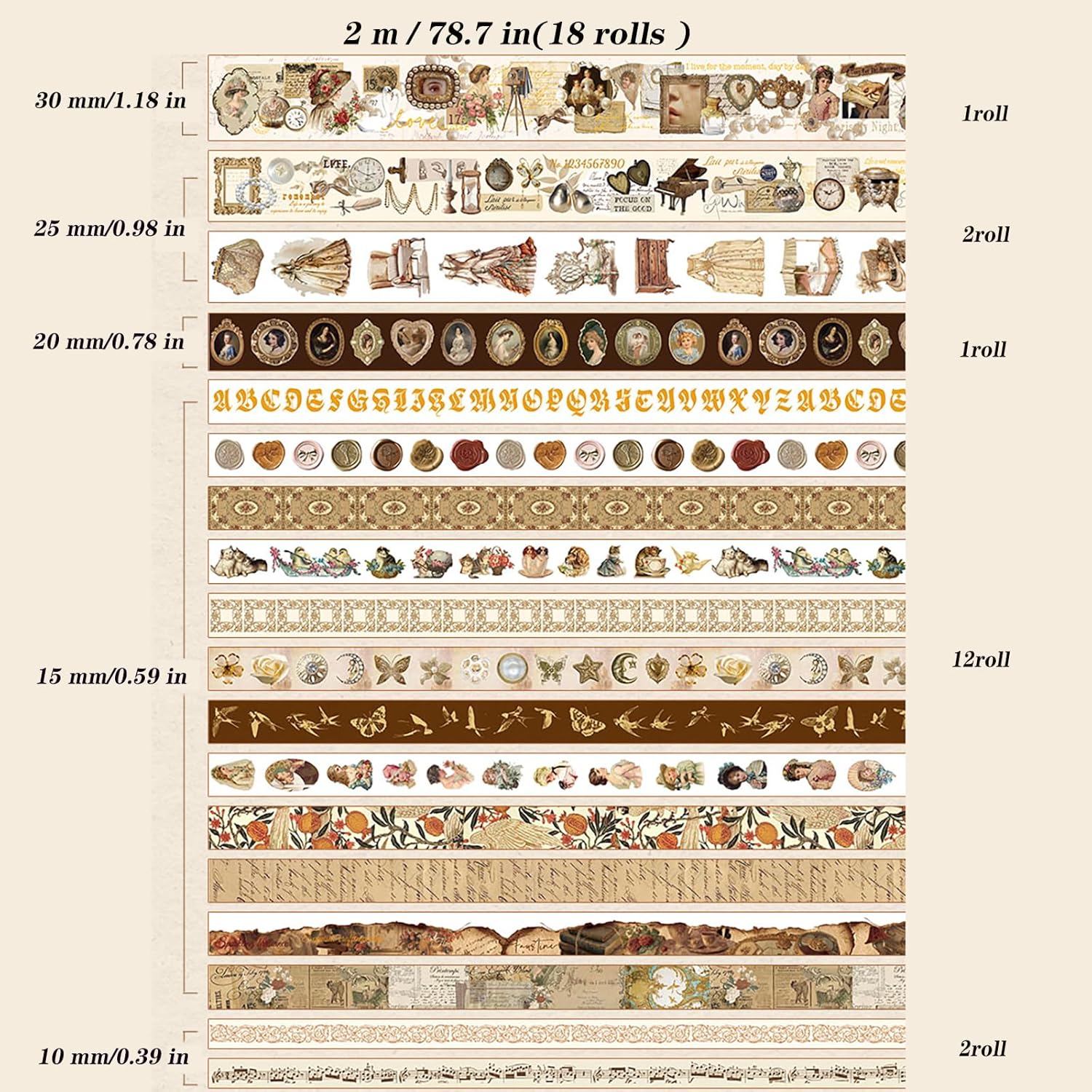 - Our vintage washi tape comes in a box with 18 rolls of high-quality washi tape in five sizes, including wide and thin washi tape. Each roll is 1.18 inches (30 mm) x 1 tape; 0.98 inches (25 mm) x 2 tapes; 0.78 inches (20 mm) x 1 tape; 0.59 inches (15 mm) x 12 tapes; 0.39 inches (10 mm) x 2 tape.