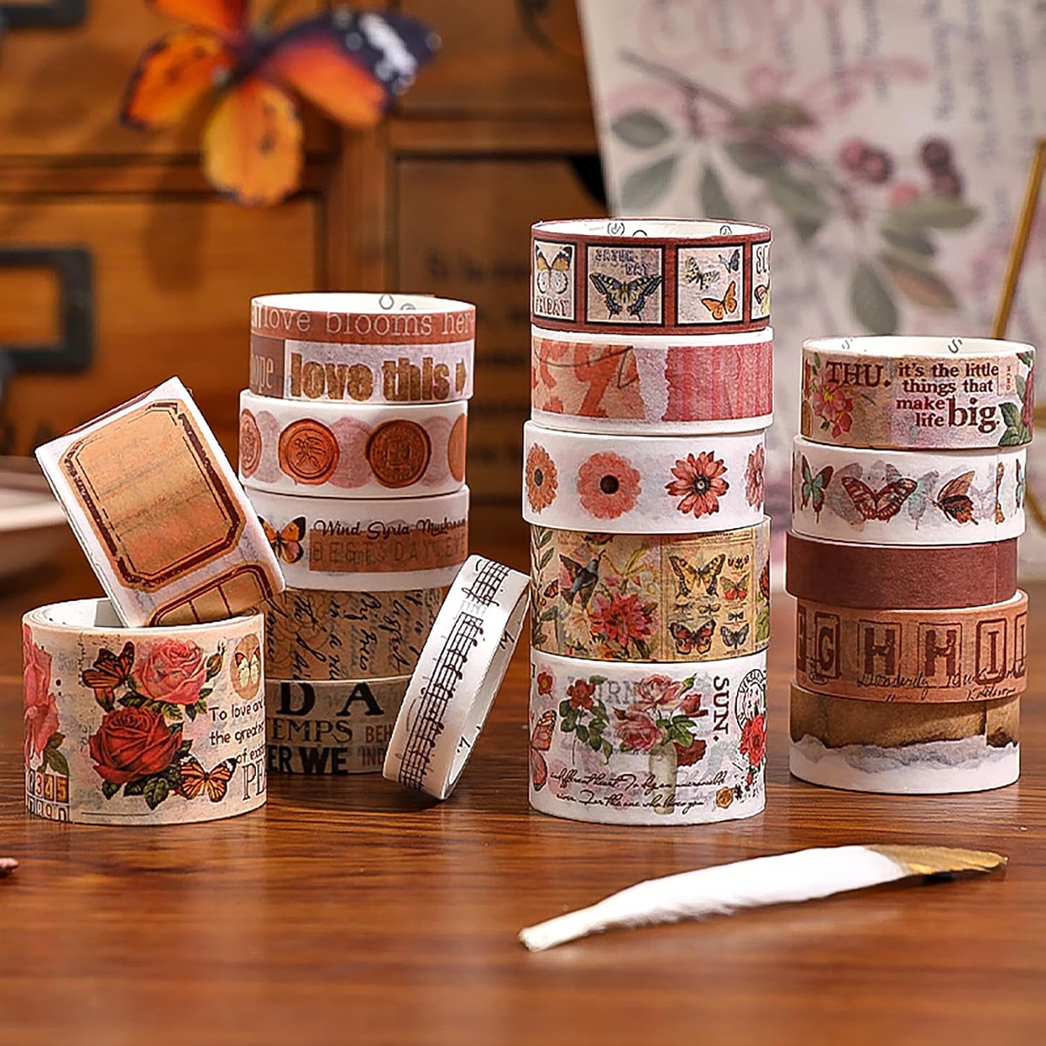 - Vintage Flower washi tape features a variety of floral and butterfly patterns. These patterns will make your creations look more natural and elegant. It is easy to use, and you can tear it in a gentle way. Make every page and every gift beautiful.