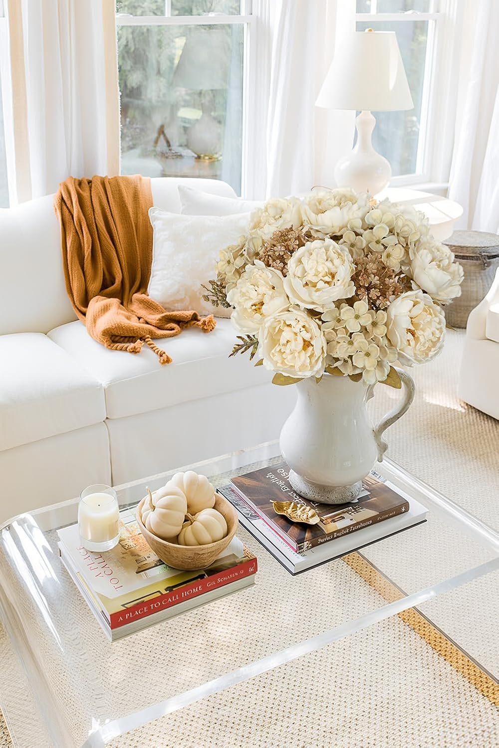 Hollyone 2Pcs Artificial Fall Flowers Bouquet 18.8" White Dried Peony Hydrangea Fake Fall Floral Silk Flowers Autumn Faux Flower Arrangement for Home Wedding Table Centerpiece Thanksgiving Party Decor