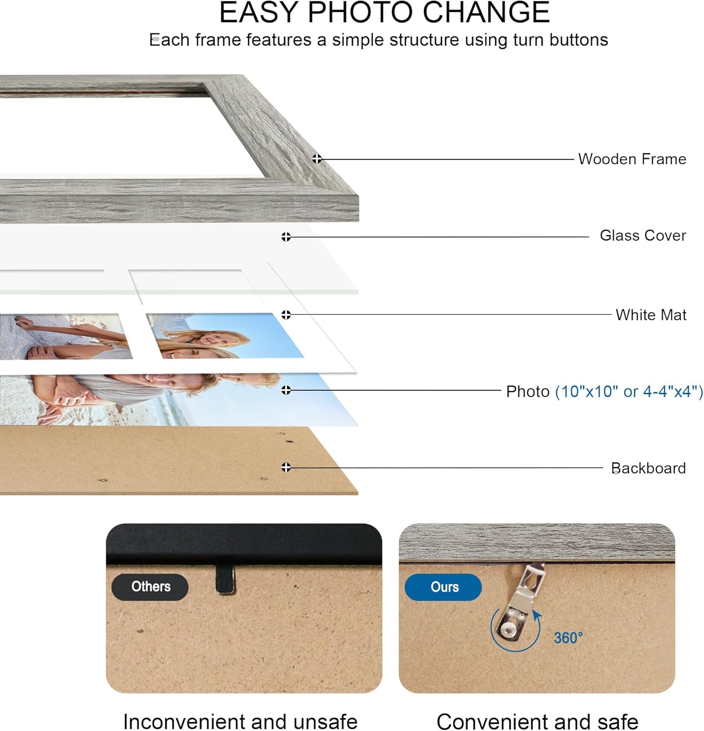 - Rustic Wood and Glass - The 10x10 collage picture frames made of durable MDF wood compared to other flimsy PS or plastics frames. we use tempered glass is an exceptional alternative to plexiglass, eliminating the inconveniences of bending, reflection, fragility, and susceptibility to scratches. Its edges are meticulously polished, ensuring your safety and shielding you from the harm caused by sharp glass edges