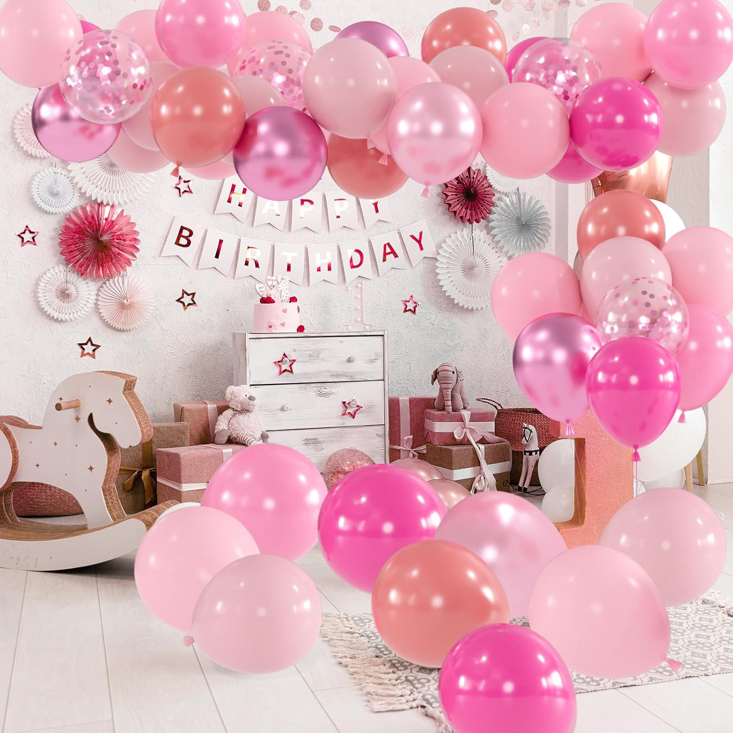 - Pink Party Balloons Kit : Come with 100pcs in 9 assorted pink balloons, Includes 15 Magenta Pink balloons, 15 metallic pink balloons, 10 hot pink balloons, 10 pastel pink balloons, 10 pearl pink balloons, 10 baby pink balloons, 10 dusty pink balloons, 10 macaron pink balloons, 10 pink confetti balloons, 2 balloon ribbons. All the balloon size is 12 inches after inflation.