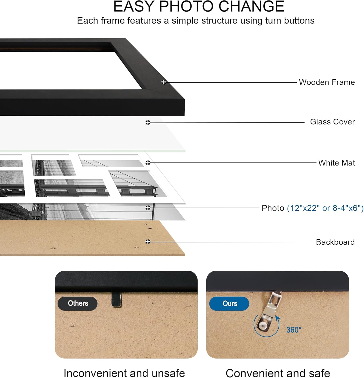 - Fit for 2 Sizes Photos - This 12 by 22 picture frames can display 12x22 picture without mat, 8 opening 4x6 picture with mat. The actual mat opening was designed slightly smaller than photo itself in order to hold it steadily while not a defect