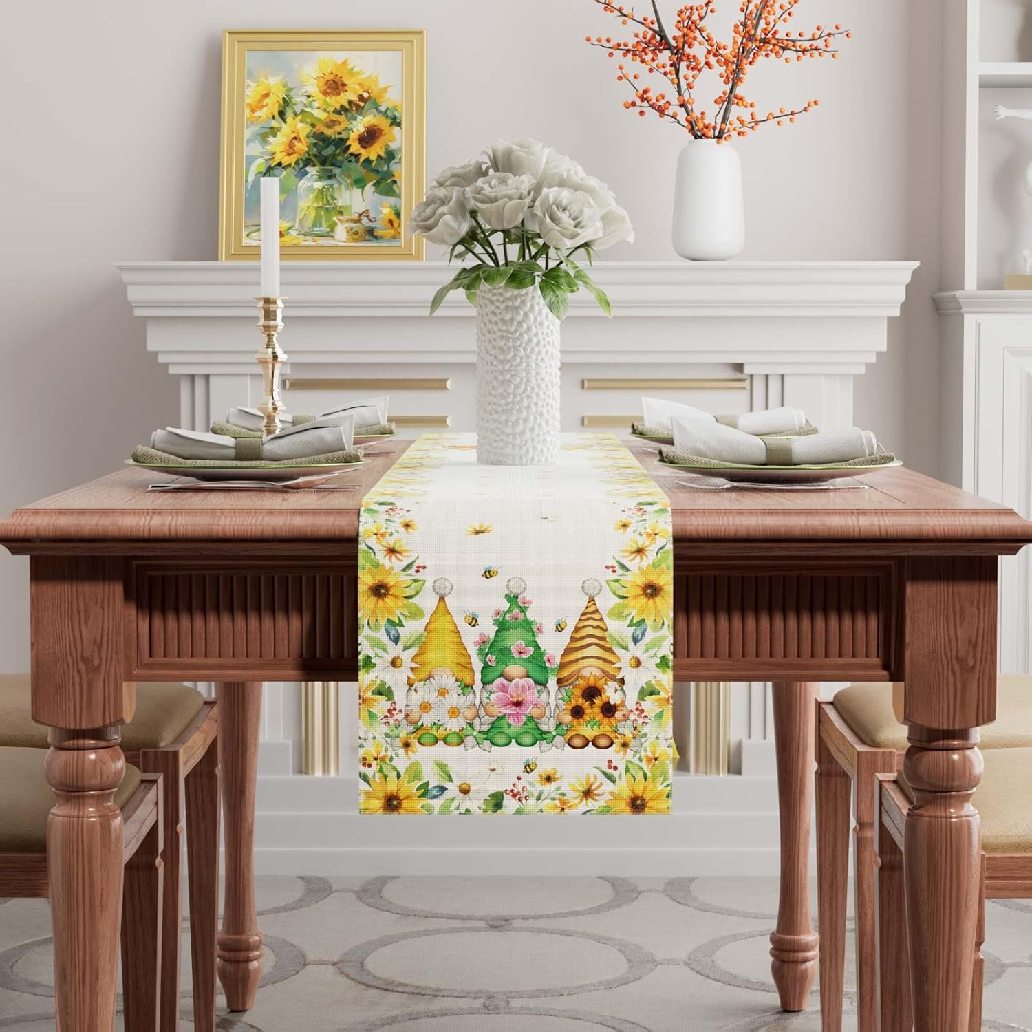 XCHI Yellow White Daisies Flowers Gnomes Spring Table Runner Burlap Table Decoration for Summer Seasonal Home Kitchen Dining Dinner Indoor Holiday Farmhouse Decor 13x36 Inch
