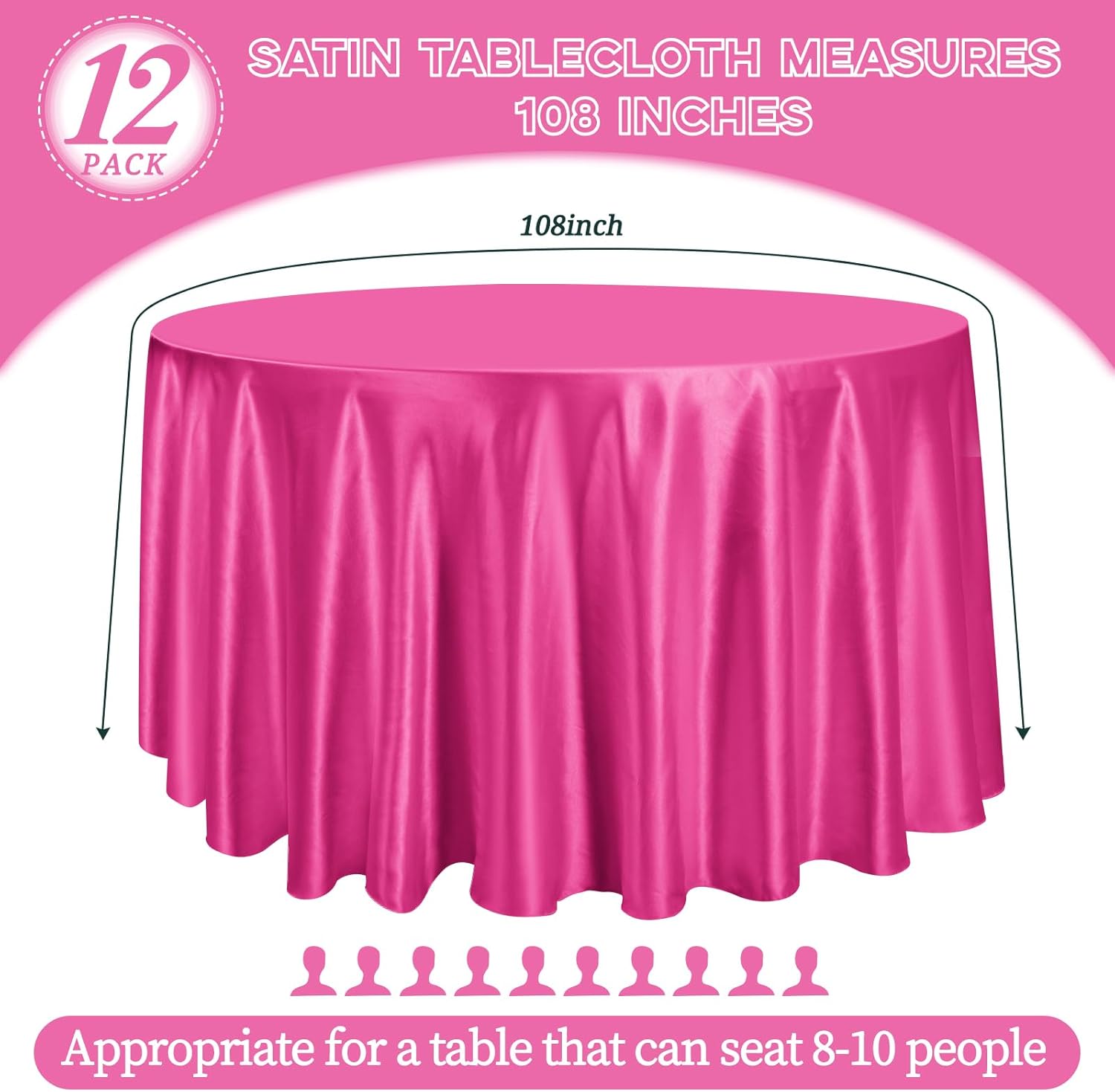 - 【Round Satin Tablecloths】12 Pieces premium hot pink satin round tablecloth. The size of silk satin table cover is 108 inches, large enough to decorate a table that can accommodate 8-10 persons. It is suitable for most household round tables and can meet your different needs. Sufficient quantities are sufficient for party decoration. The tablecloth size is usually larger than your table size. Please measure your table size before buying.