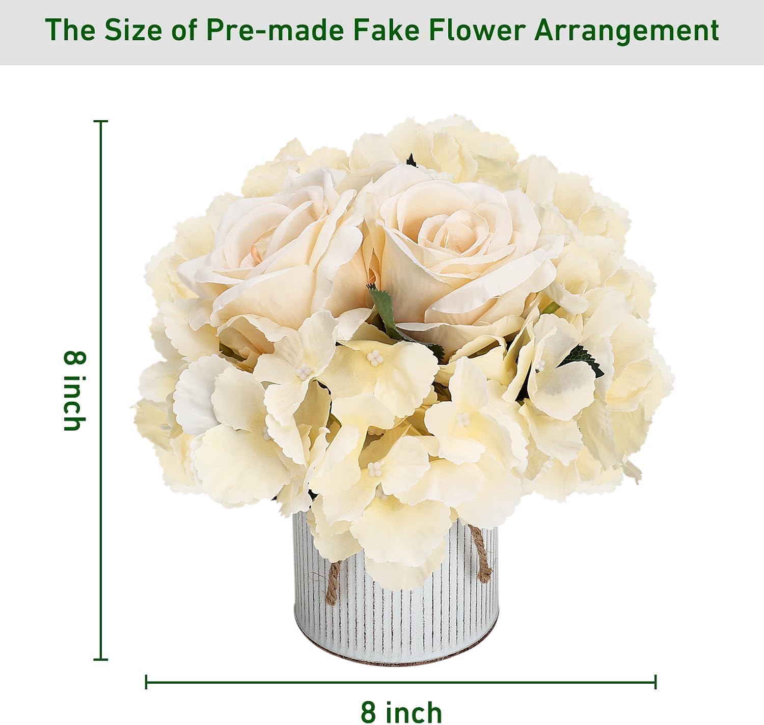 - Pack of 6 pre-made artificial flowers with rustic metal pot for table centerpieces. Consists of high quality champagne fake roses and faux hydrangeas.