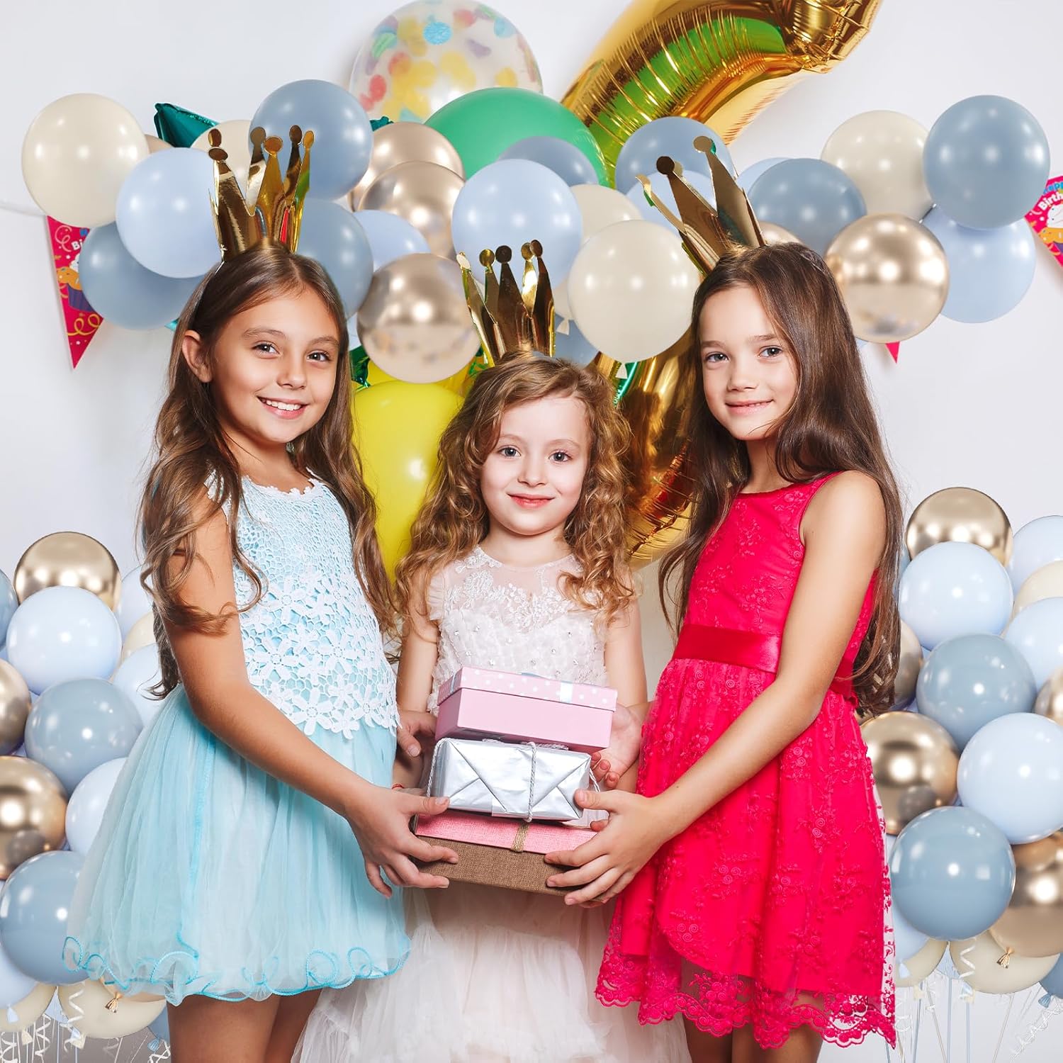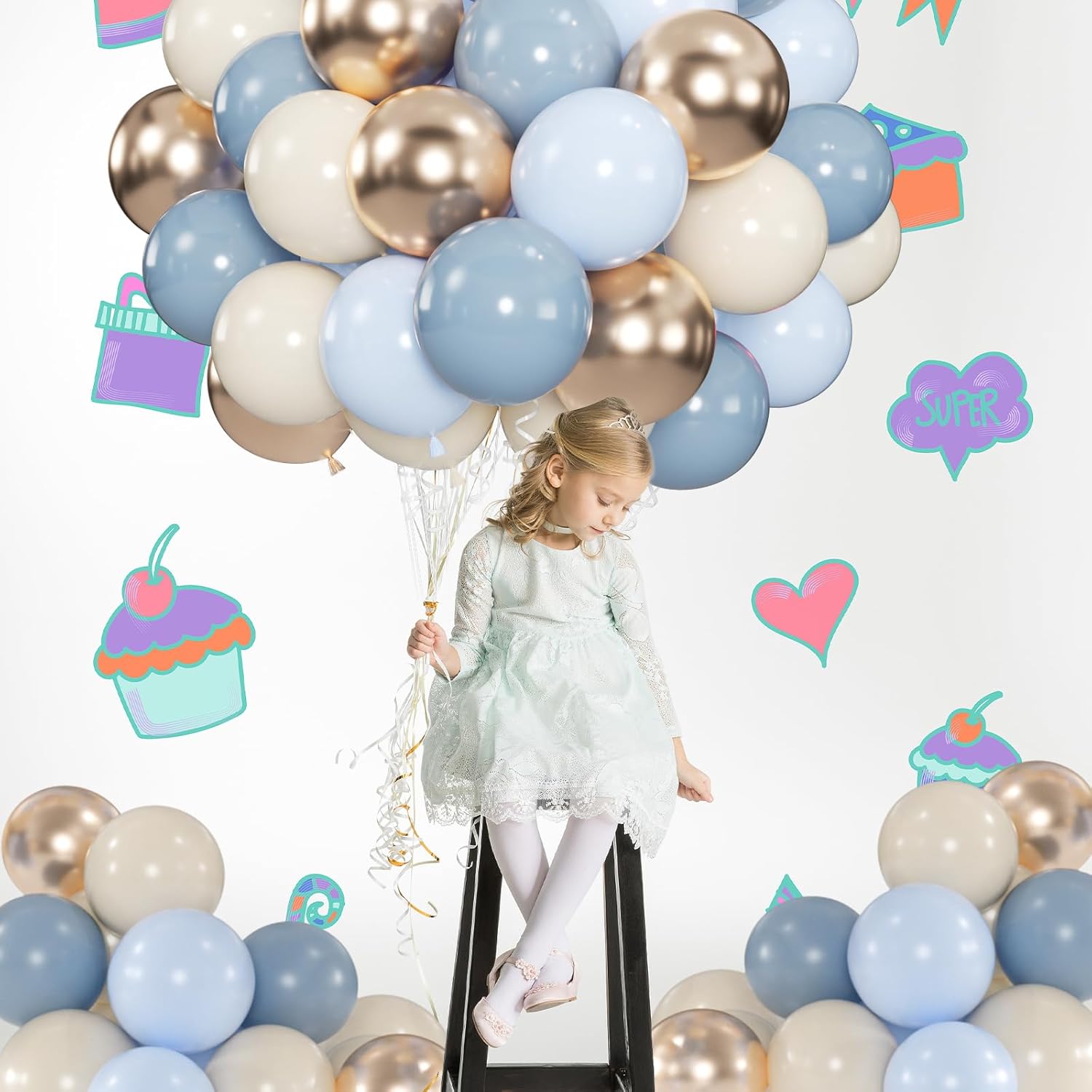 - Curated Twilight Color Palette : 100 premium 12” dusty blue and gold balloons kit (30 retro dusty blue balloons, 25 fog pastel blue balloons, 25 sand white balloons, 20 metallic champagne gold balloons) + 2x 33ft ribbons. Create ethereal boho arches or photo walls!