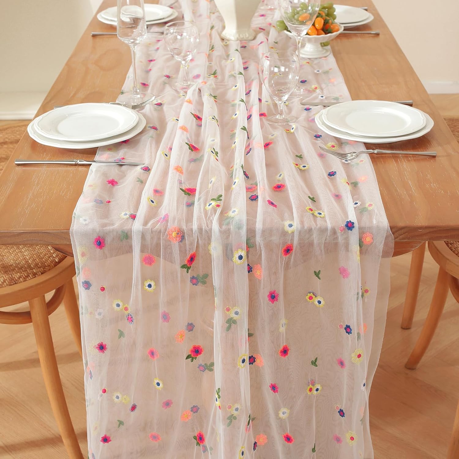 - Delicate Embroidery Daisy Design:This is a flower embroidered table runner. Daisy design and solid champagne gauze combination of both retains a sense of simplicity and add some full of life feeling