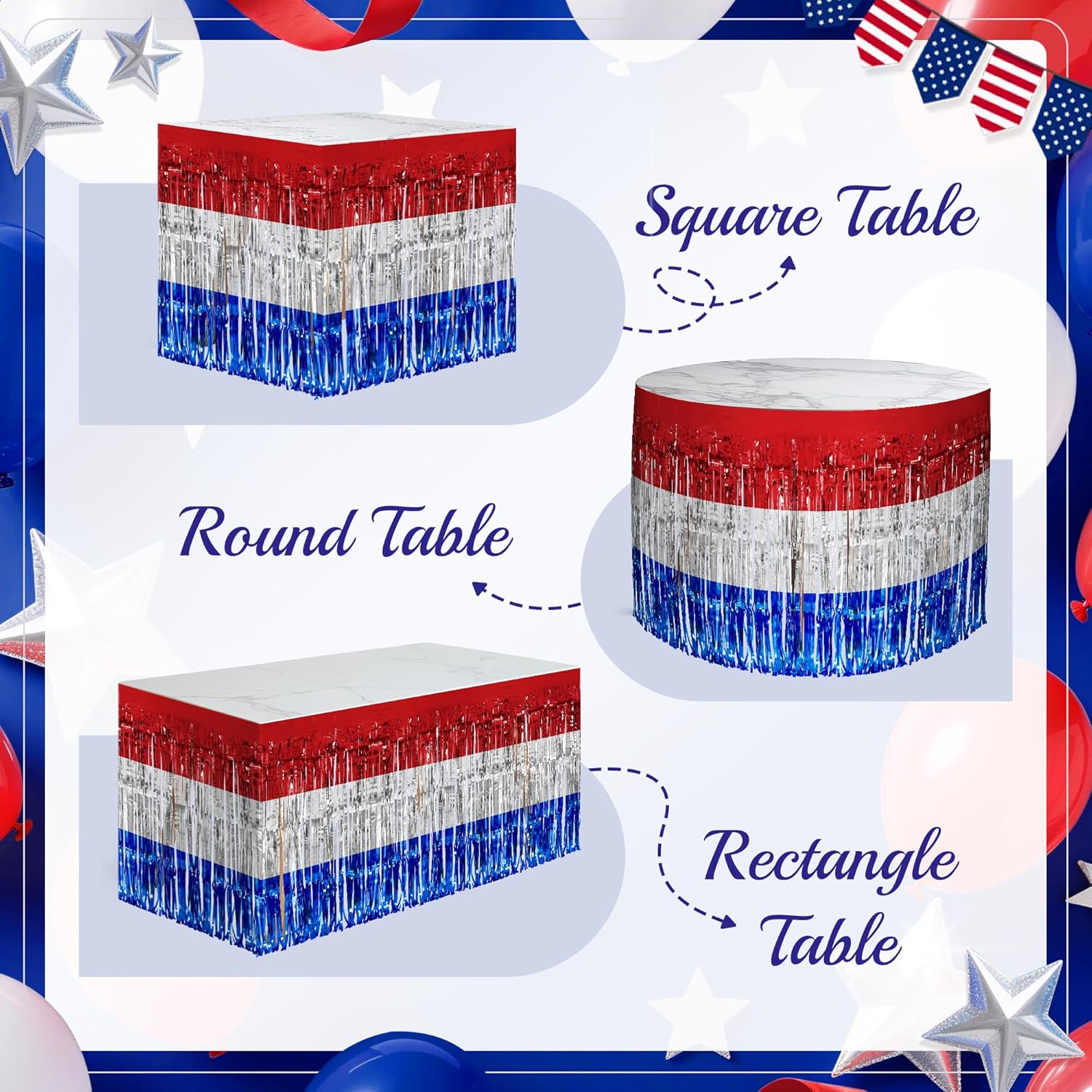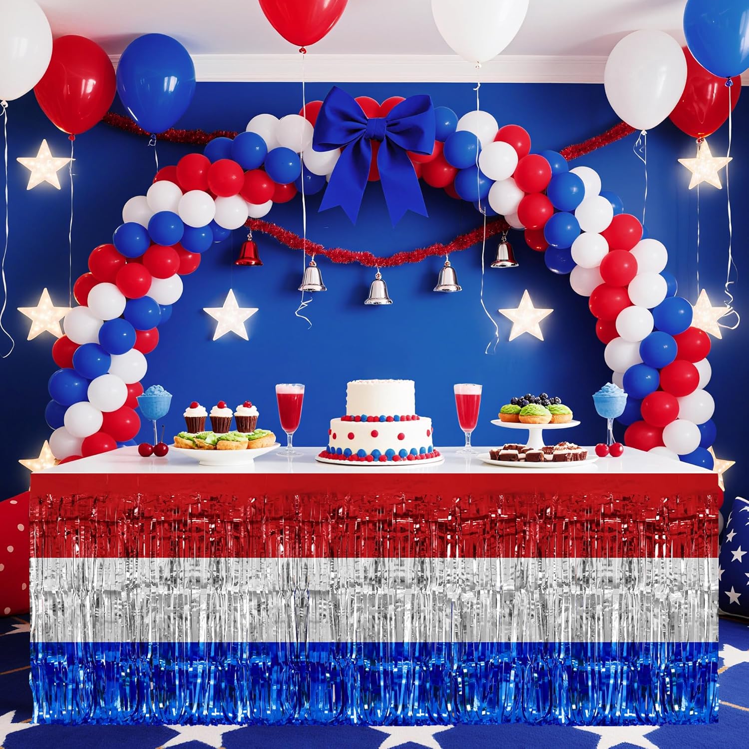 2 Pack Red&White&Blue Table Skirts, 29x108" Metallic Foil Tinsel Fringe Table Skirt for Rectangle Tables Streamer Curtains Backdrop, Party Decorations for Birthdays, Weddings, Holidays