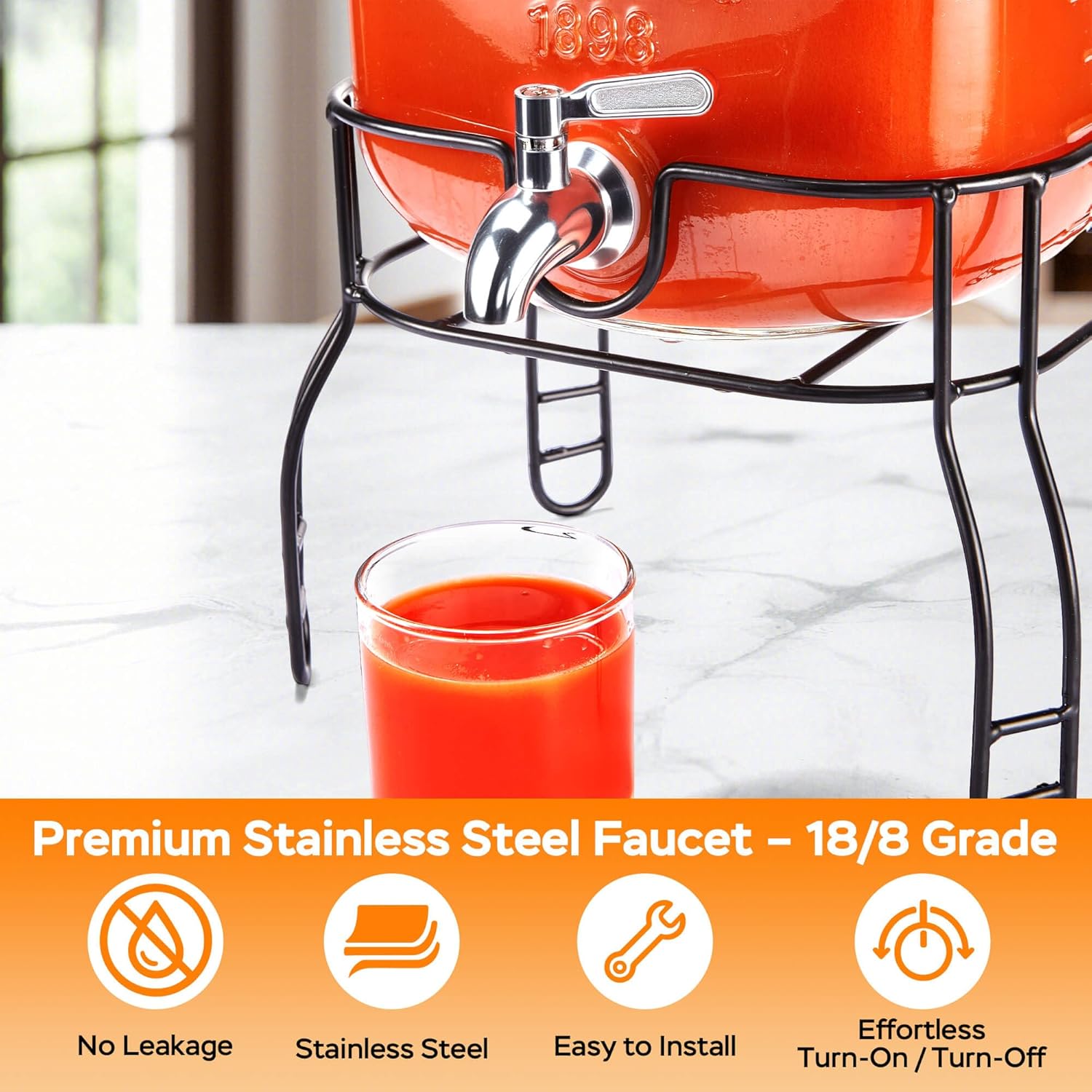 - Thickened Food-Grade Glass - Our 2 Gallon Drink Dispensers are made of thickened, food-grade glass that is sturdy, durable, and resistant to breakage. The large capacity makes cleaning easy and convenient. Each glass beverage dispenser with spigot comes with a 304 stainless steel faucet that is rust-resistant, leak-proof, easy to assemble, and built to last.