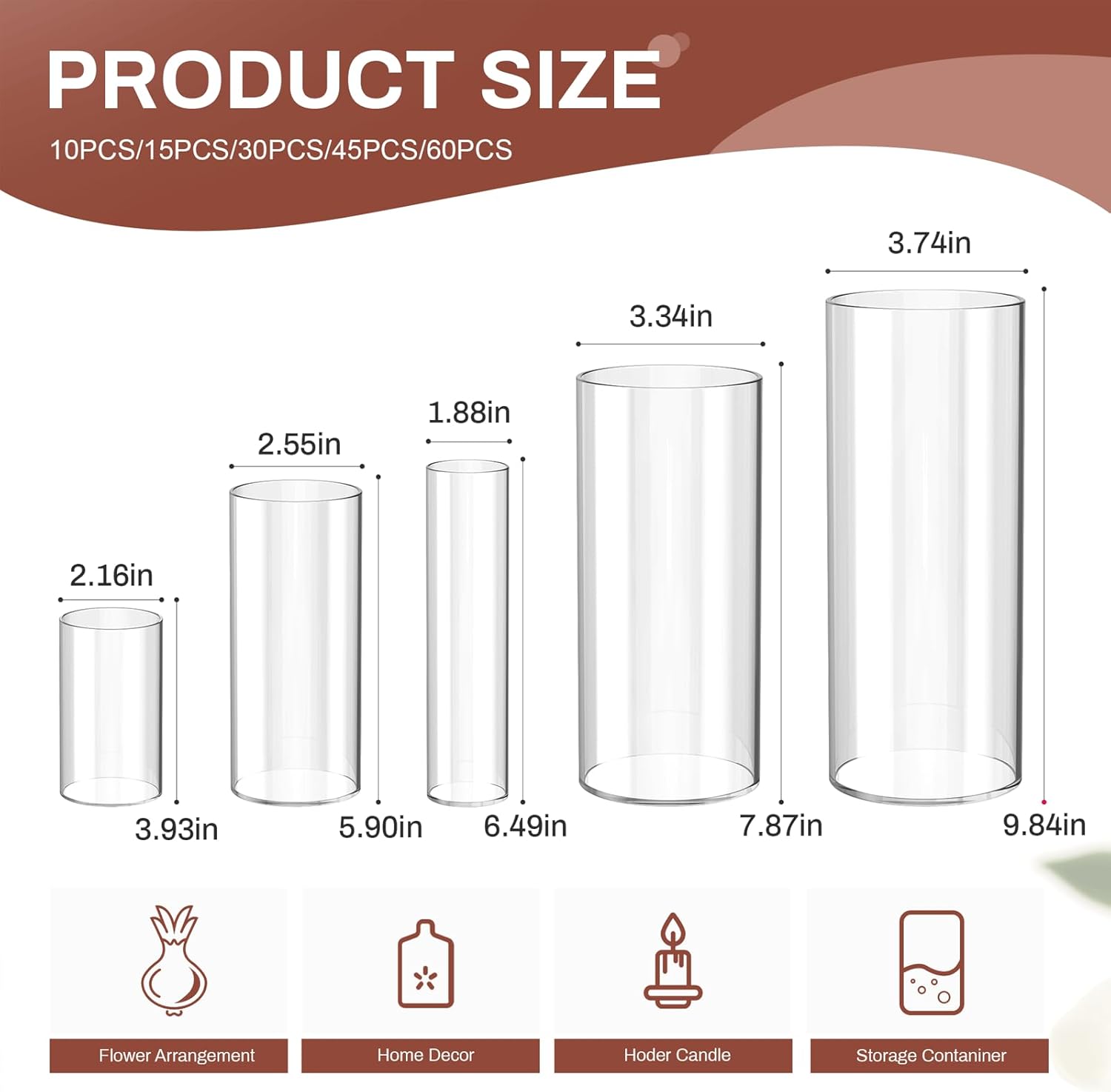 - 5-Size Cylinder Vase Set for Versatility From minimalist single stems (2.1×3.9 inchs) to lavish bouquets (3.7×9.8 inchs), 10 premium Cylinder vases in 5 sizes fit orchids, roses, or succulents.