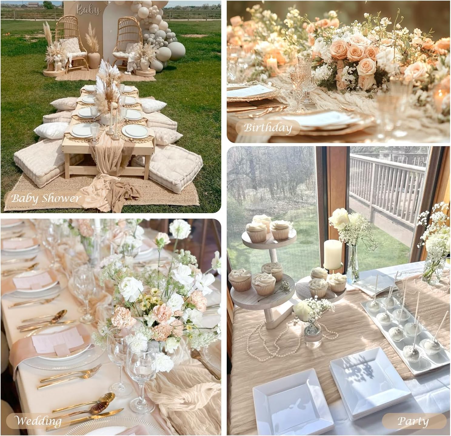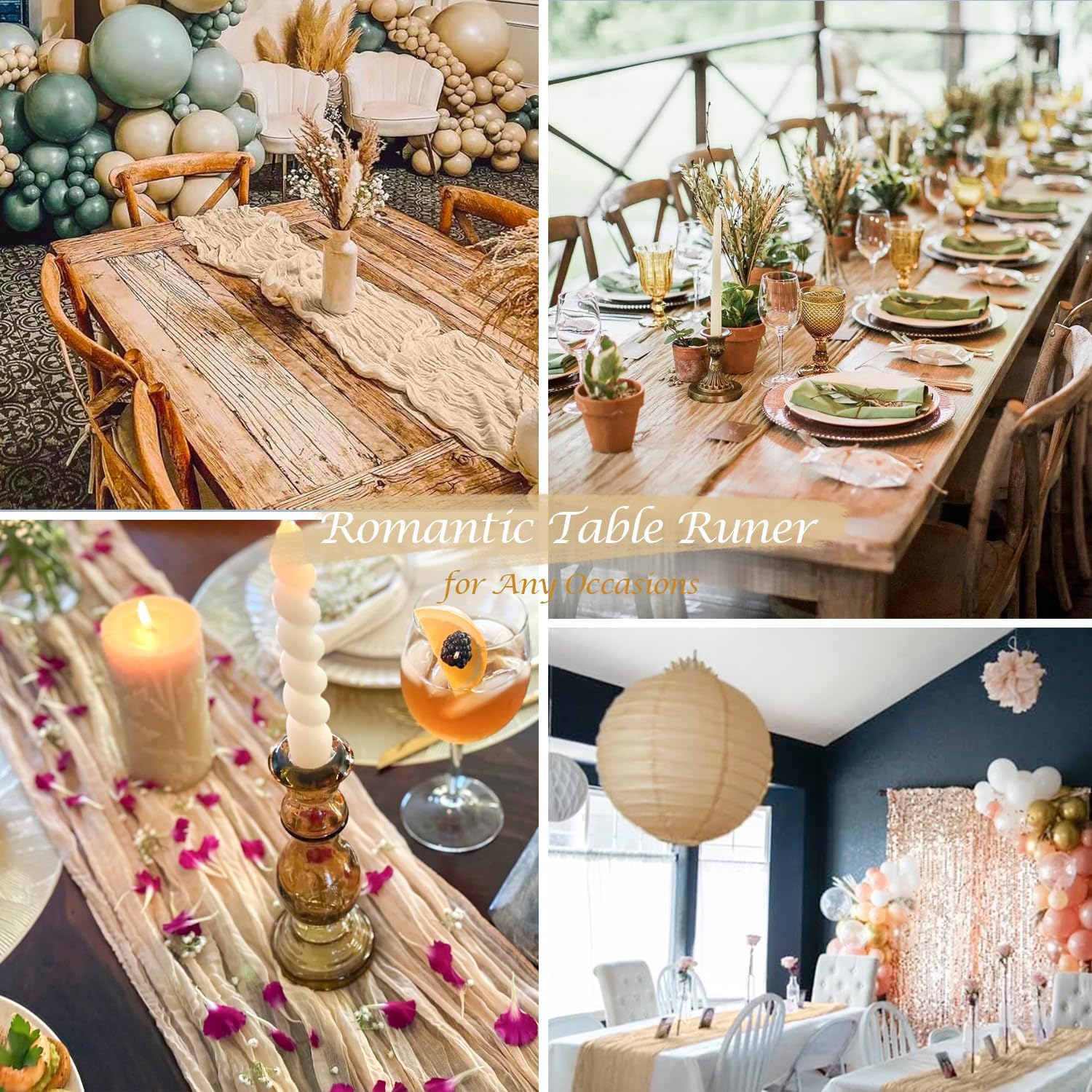- 🥂【Reusable & Soft】These romantic beige table runner is made of premium cheese gauze fabric with beautiful crinkling. Soft feeling, reusable, washable and fade resistant. These cheesecloth table runner champagne adopt unique pleated workmanship, adding a touch of romantic and elegant to your events. The boho wedding table runner is sheer, natural drape, lightweight and skin-friendly. Soft table linen with gorgeous finished edges drapes gracefully across your banquet table, adds to romantic, delicate, and flowy vibe.