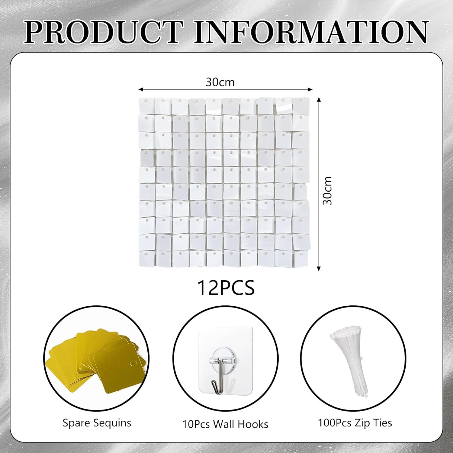 12PCS White Shimmer Wall Backdrop, Square Sequin Photo Backdrops Panel, Glitter Wall Background for Birthdays, Weddings, Graduation, Engagements, Disco Bachelorette Party Decoration (3FTx4FT)