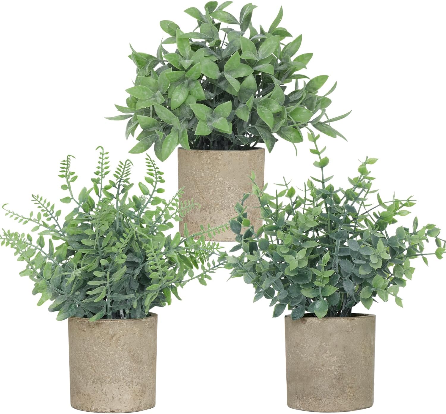 - Small Size & Adjustable Shape: This set includes 3 small green artificial plants: a eucalyptus, a Boston fern, and a boxwood. Each measuring approximately 9.4 inches in total height (from the top of the plant to the bottom of the pot) and 5.9 inches in width when the leaves are fully spread. The gray paper pulp pots are about 2.95 inches wide and 3.1 inches tall. You can gently adjust the leaves to achieve your desired shape and fullness. NOTE: The leaves may be slightly compressed during shipping β simply reshape them by hand to restore their natural appearance