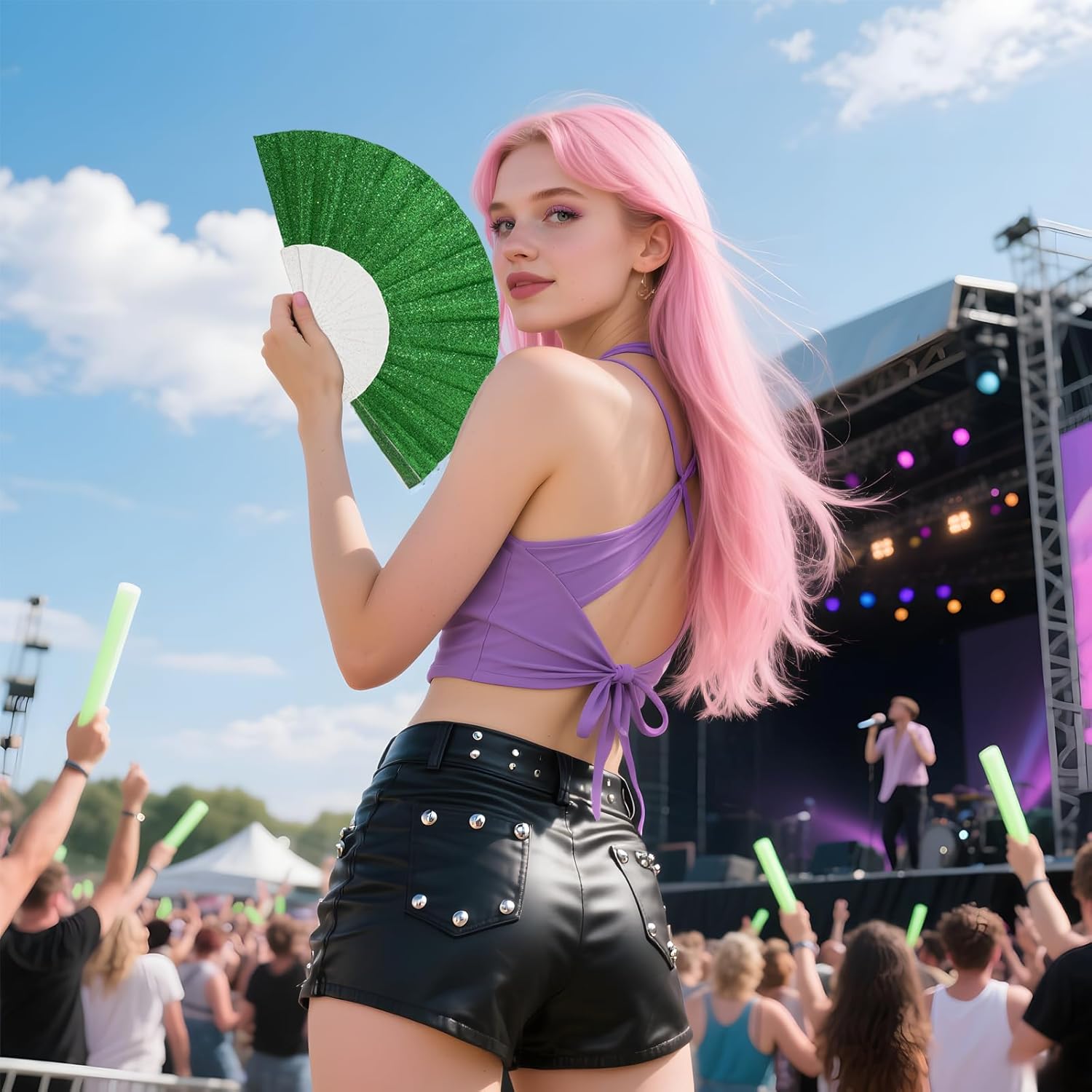 - Stunning Glitter Effect & Robust Frame: With its glitter flashpoints fabric and polyester construction, this fan’s holographic white design creates a striking impression. Ideal for weddings, themed occasions, festivals, and more.