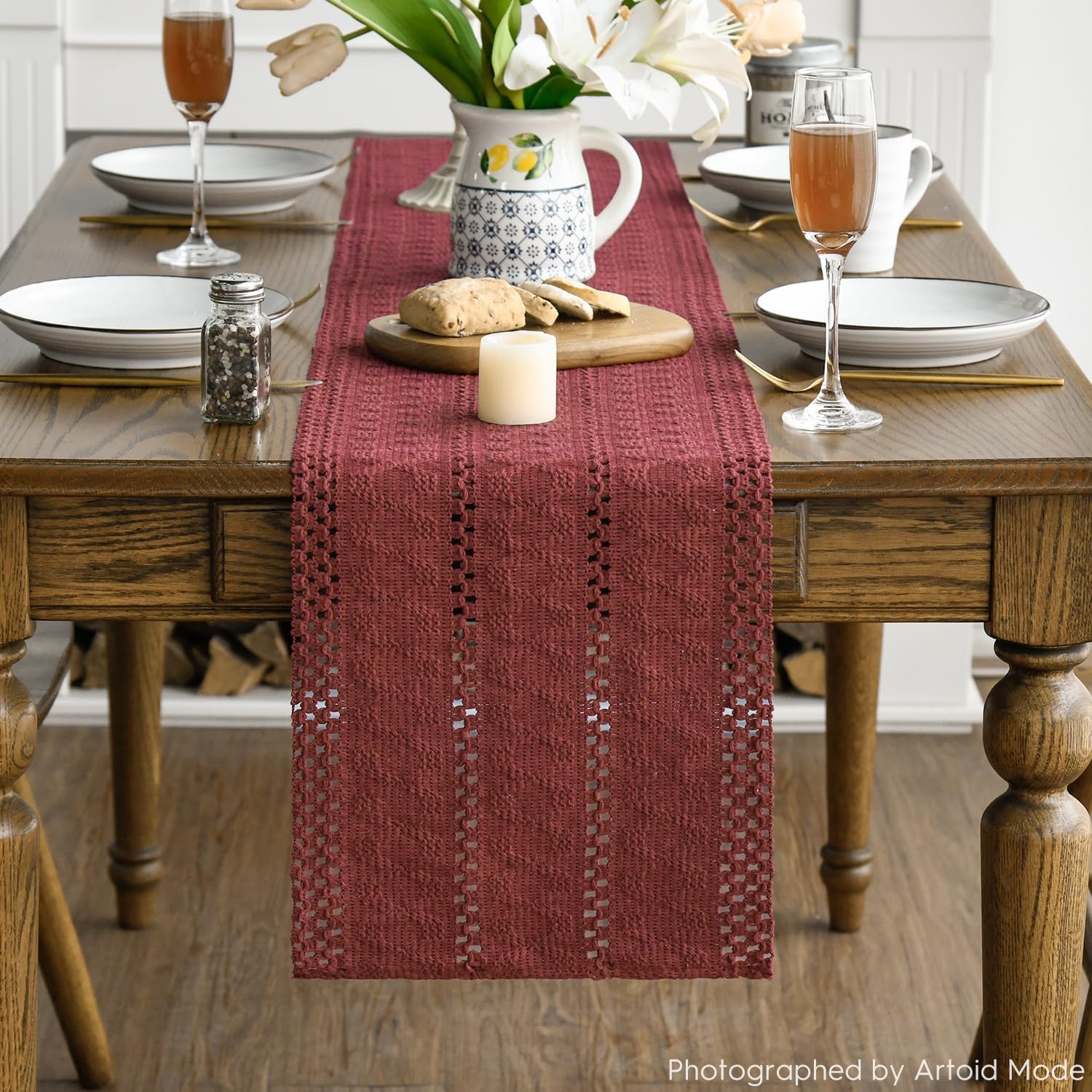 Artoid Mode Red Farmhouse Woven Rustic Hollow Table Runner, Seasonal Holiday Hollow Kitchen Dining Table Decoration for Home Party Decor 12x60 Inch