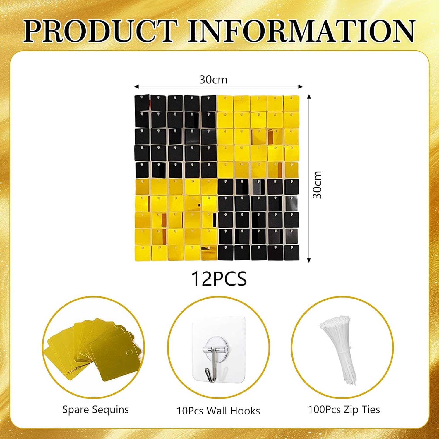 - 【Package Includes】Each box includes 12 black gold sequin wall panels (12"x 12" each). We provide enough zip ties (100 pcs), a pack of spare sequins, and wall hooks (10 pcs) to support the weight of the wind panel, as well as an installation manual. 12pcs can cover 3x4ft place. More boxs will cover a larger area and have a fuller look.