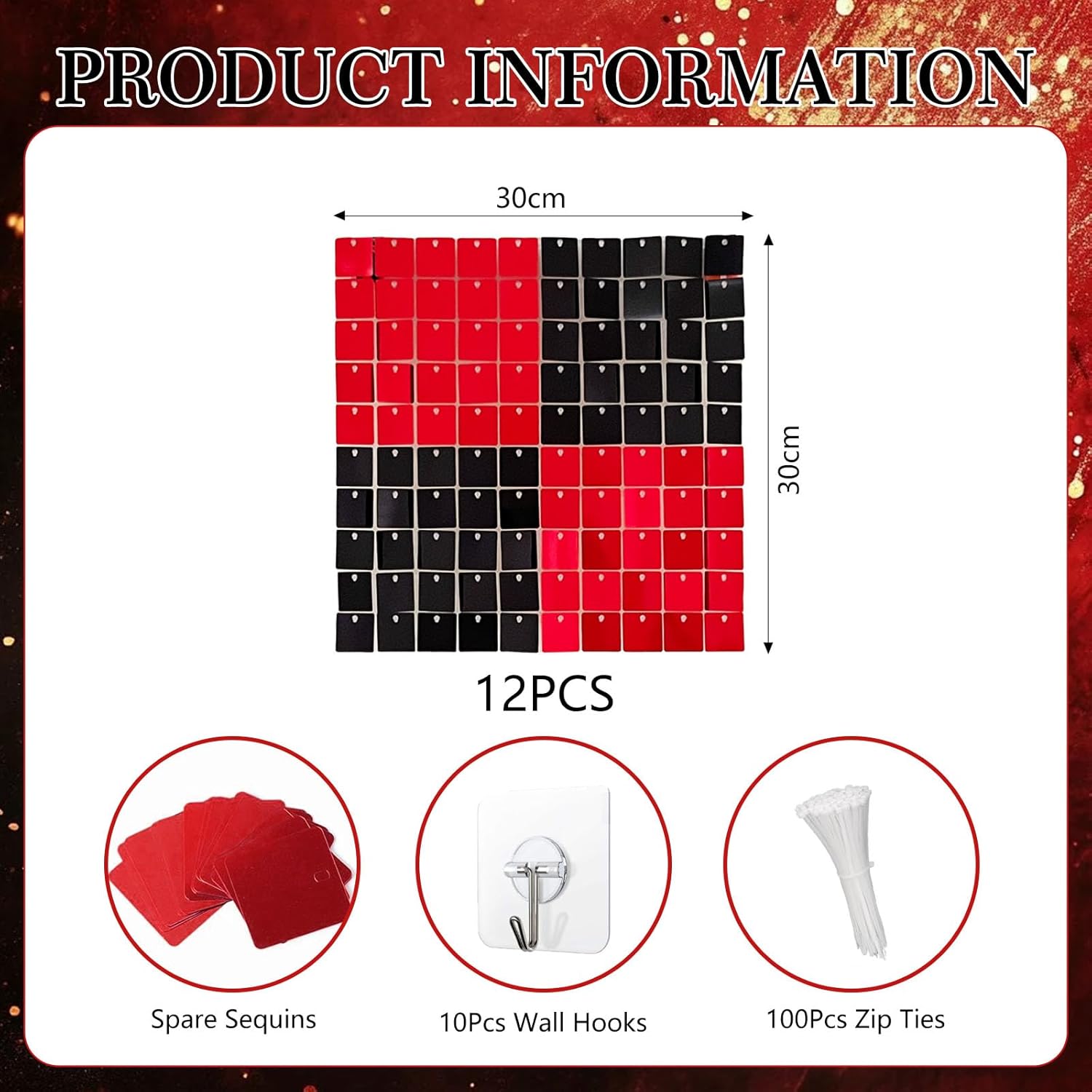 12PCS Black Red Shimmer Wall Backdrop, Square Sequin Photo Backdrops Panel, Glitter Wall Background for Birthdays, Weddings, Christmas, Halloween, Disco Bachelorette Party Decor (3FTx4FT)