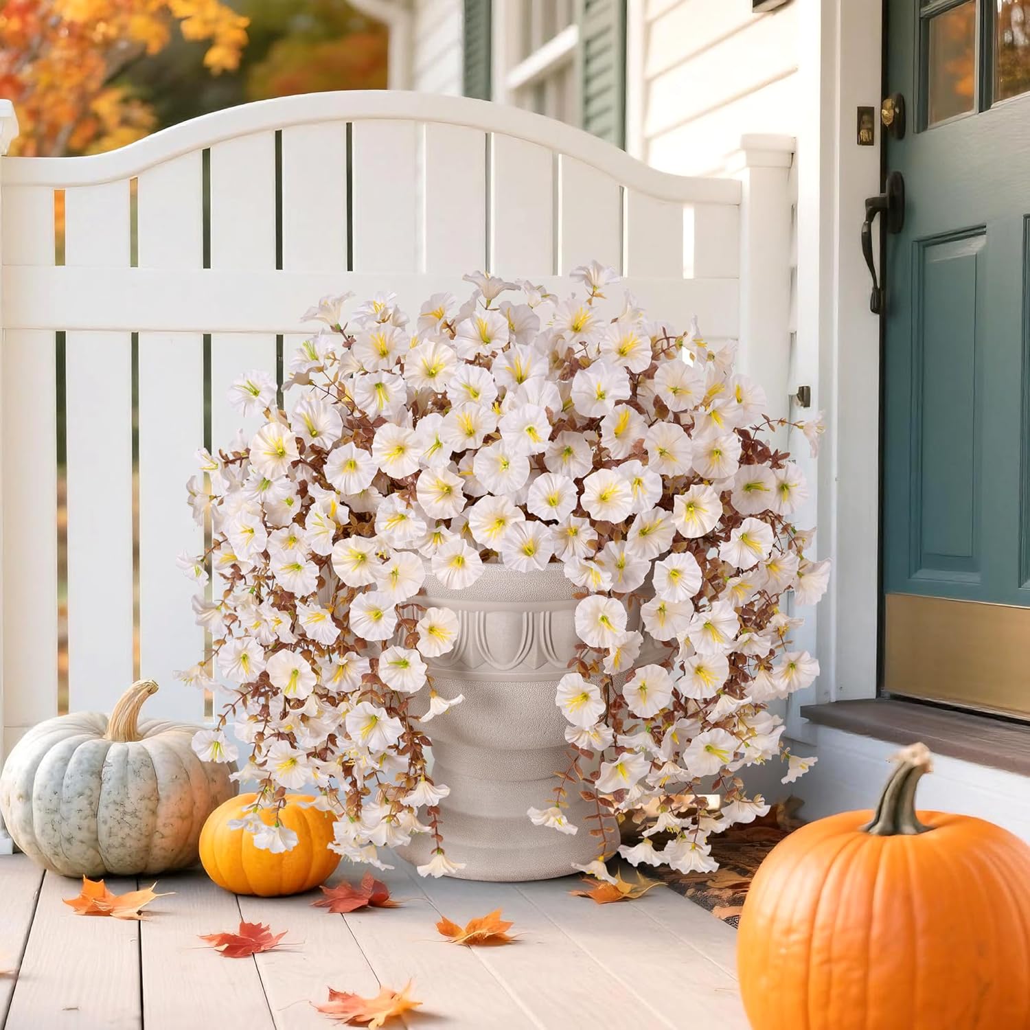 - UV Resistant and Never Fade:These artificial hanging flowers are UV resistant and never fade, can be put outside, living room, office, kitchen, garden, balcony, wall, porch, window, balcony, yard, urn, planter, payhway, front door, flowerbed sill or indoor veranda. Perfect for home, weddings, hotels, terrace, guesthouses, parties or other indoor outside place decoration, create an illusion of enlarged space.