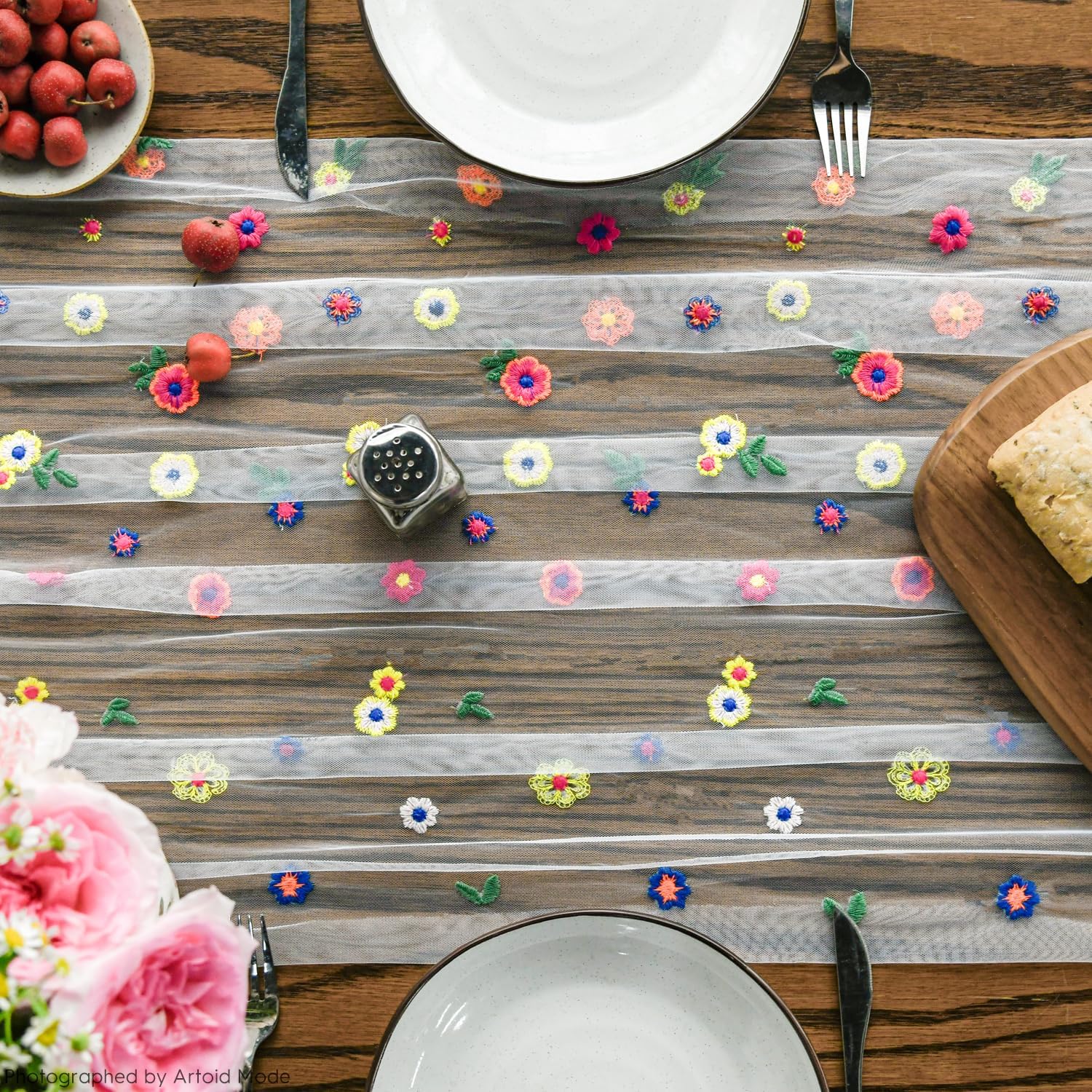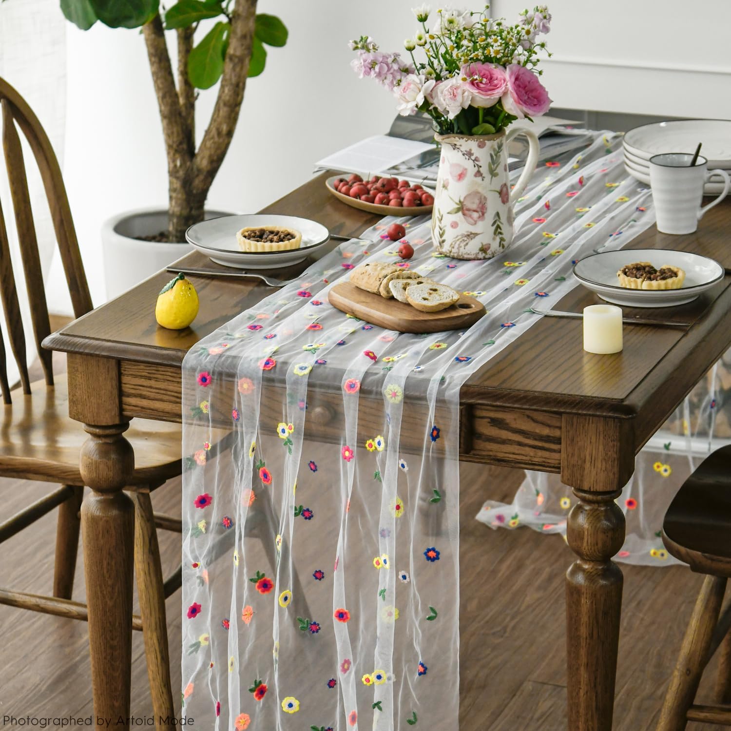 Artoid Mode 3PCS Embroidery Daisy Gauze Table Runner 120 Inch 10FT, Seasonal Sheer Kitchen Dining Holiday Wedding Birthday Table Decor for Home Party