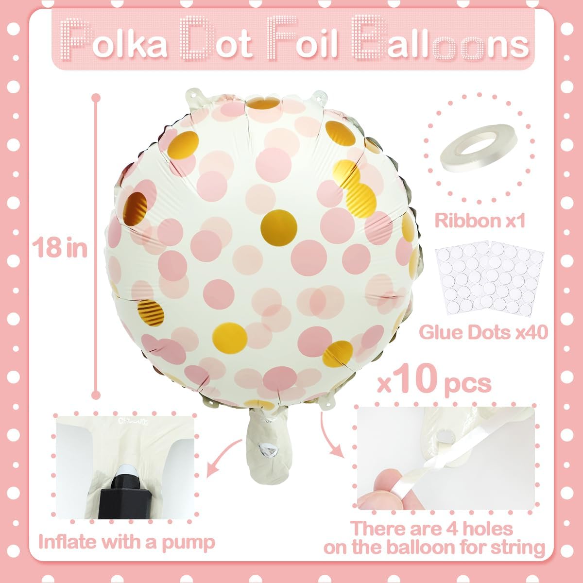 - Included Components : 1 Ribbon, 10 Pieces Pink and Gold Polka Dot Foil Balloons, 40 Glue Dots
