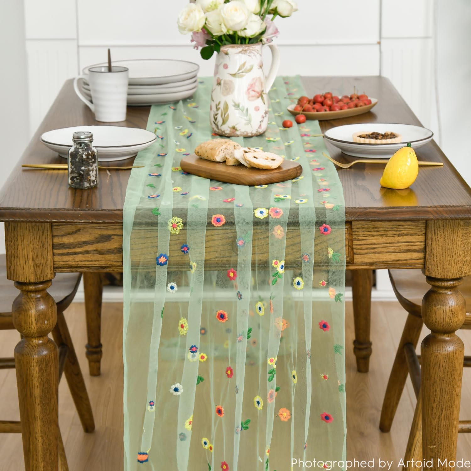 Artoid Mode 3PCS Sage Green Embroidery Daisy Gauze Table Runner 120 Inch 10FT, Seasonal Sheer Dining Holiday Wedding Birthday Table Decor for Home Party