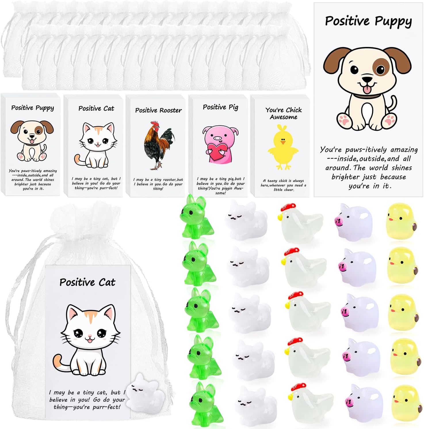 - โ Employee Thank You Gifts Bulk Set - We will provide you with a total of 100 pieces of employee appreciation gifts, including 100 positive resin animals, 100 cards and 100 organza bags;our group gifts for coworkers/back to school gifts for students are designed 5 different resin accessories with different cards,including pigs, dogs, cats, hens, chickens with funny pun quotes,to express your gratitude and encouragement; Sufficient quantities can easily meet your gift-giving needs.