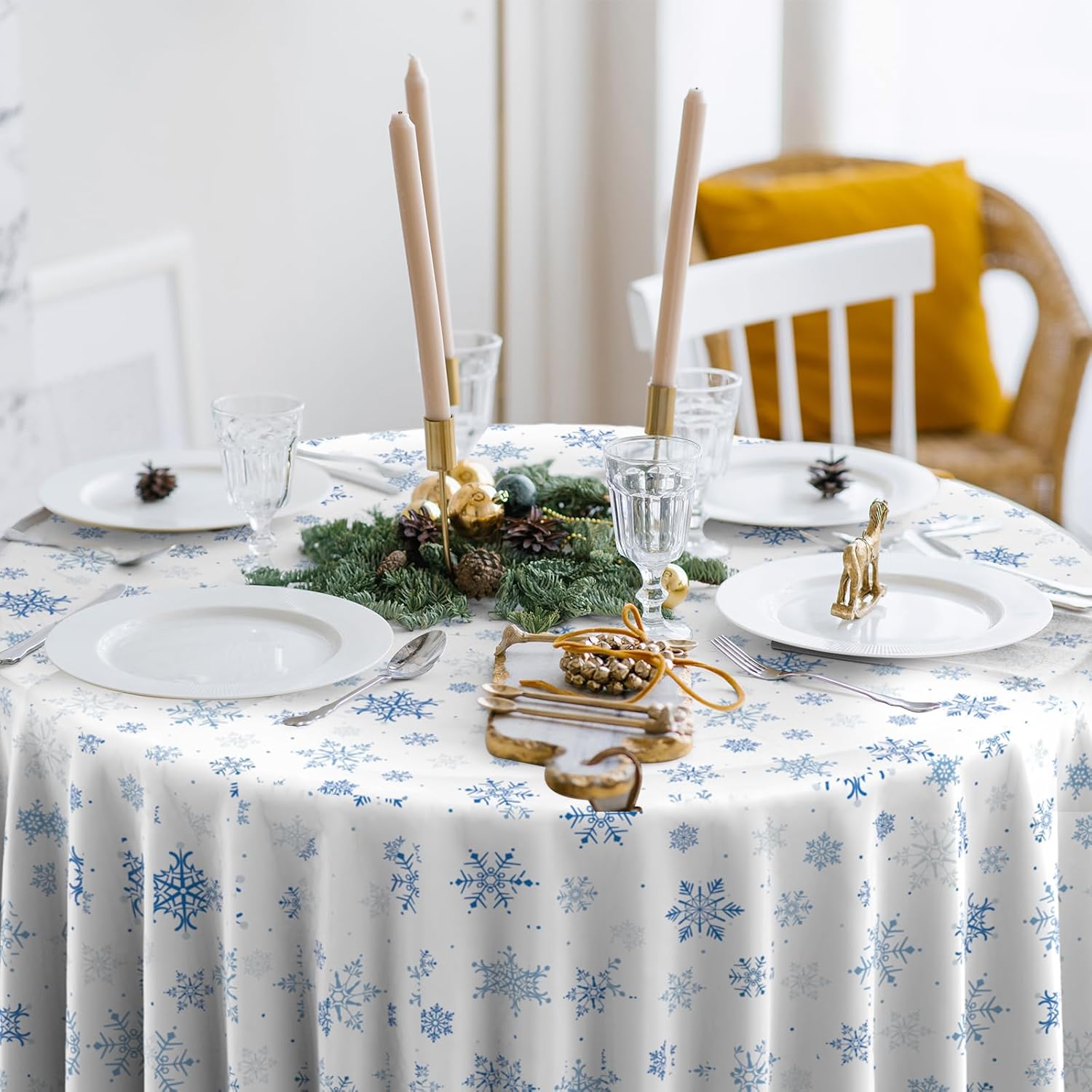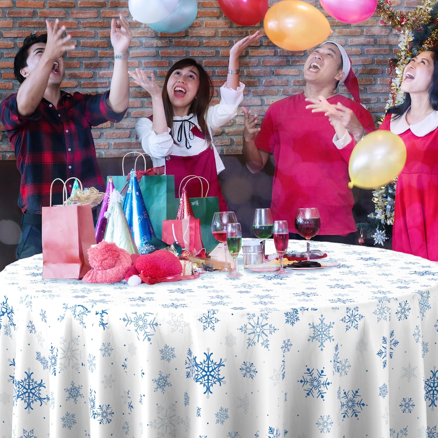 - Extra large size: these blue snowflake Christmas party tablecloth measures approx. 84 inch, which fits for various-sized tables that can accommodate 8-10 people, Itβs large enough for your to hold a winter holiday and Christmas theme party with your family and friends to share happiness