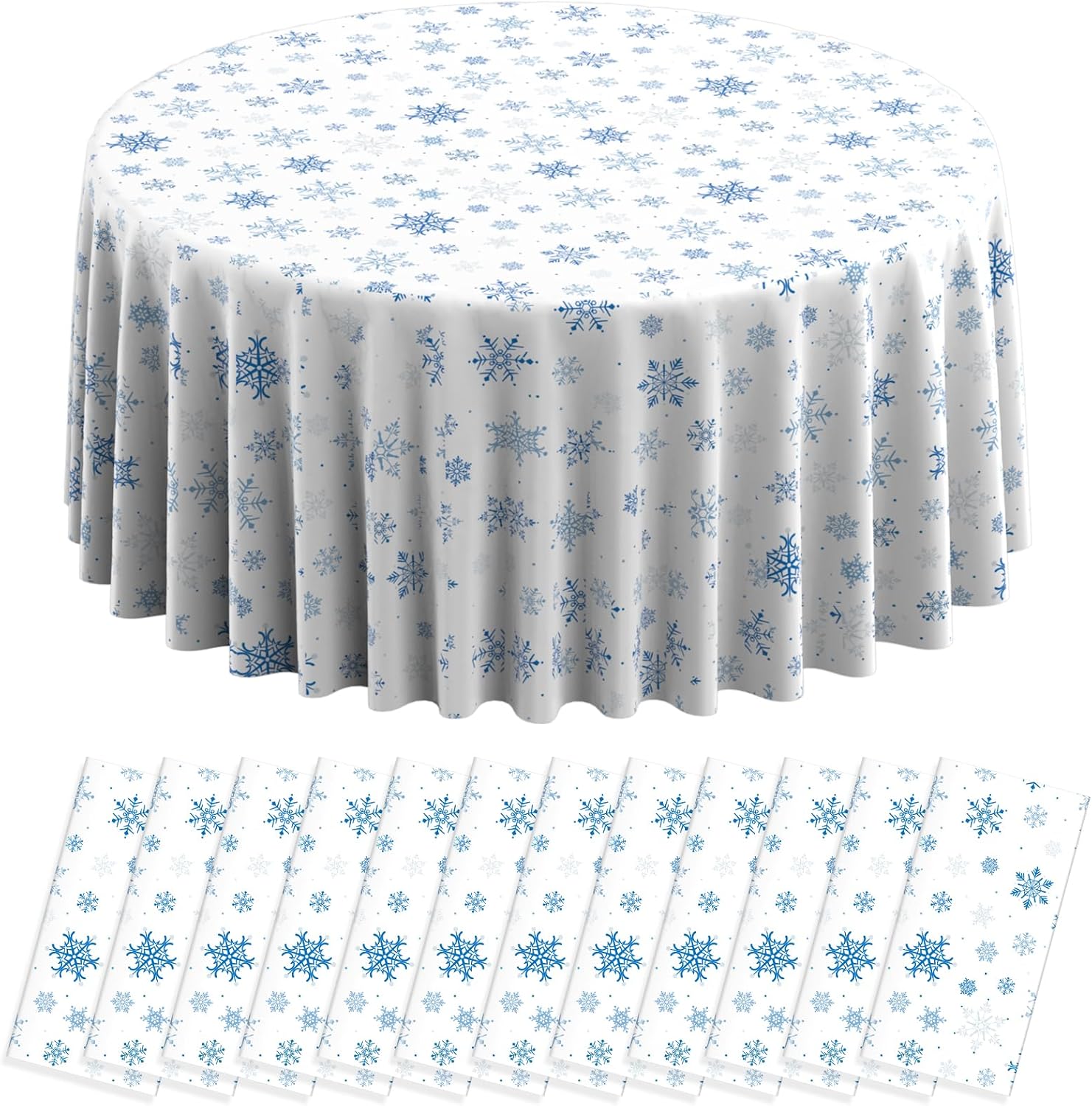 - What will you receive: 12 pieces round Christmas party tablecloth,all over printed with blue snowflake patterns on white backdrop,ideal for decorating your winter holiday and Christmas party supplies and decorations