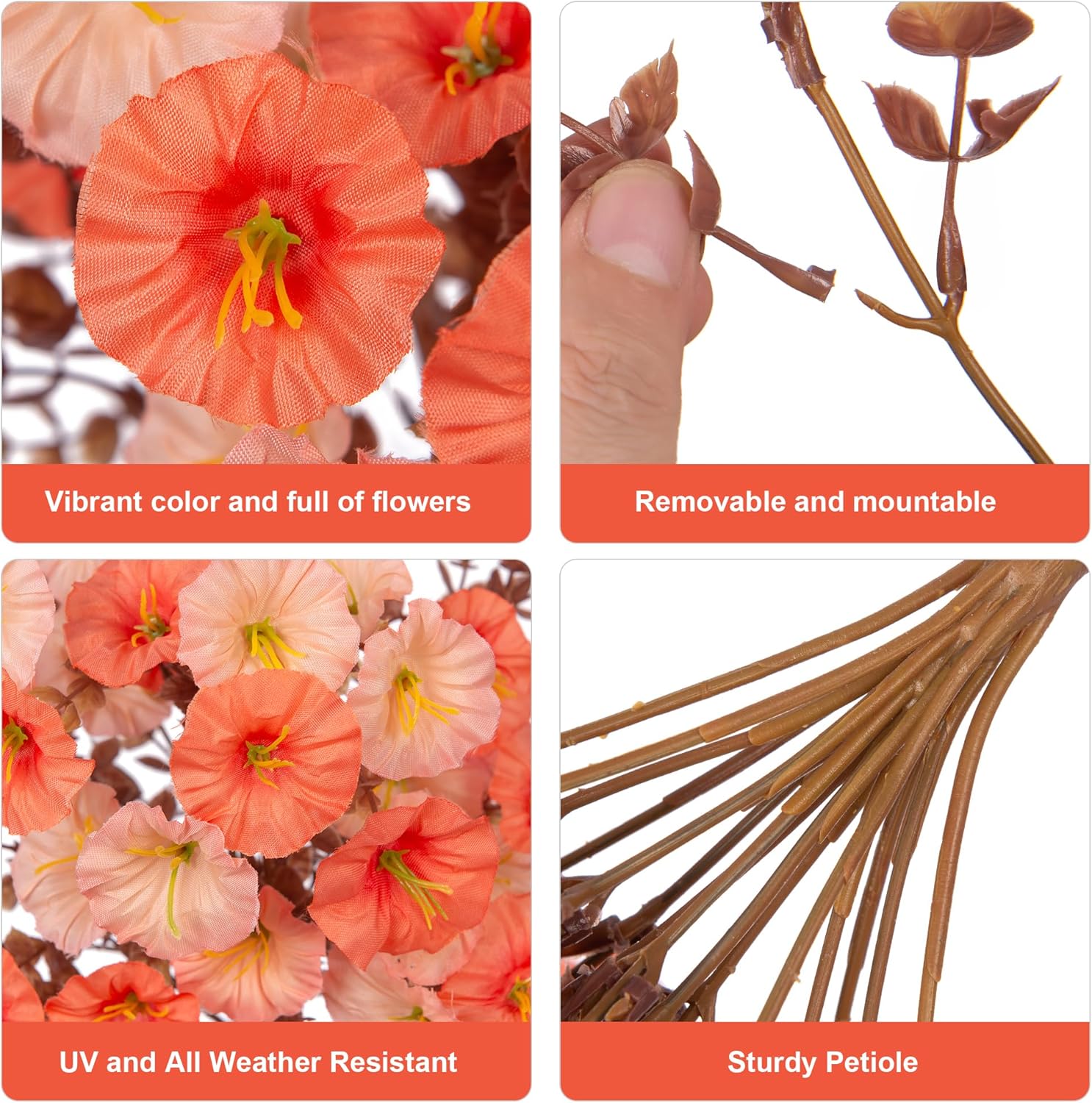 - UV Resistant and Never Fade๏ผThese artificial hanging flowers are UV resistant and never fade, can be put outside, living room, office, kitchen, garden, balcony, wall, porch, window, balcony, yard, urn, planter, payhway, front door, flowerbed sill or indoor veranda. Perfect for home, weddings, hotels, terrace, guesthouses, parties or other indoor outside place decoration, create an illusion of enlarged space.