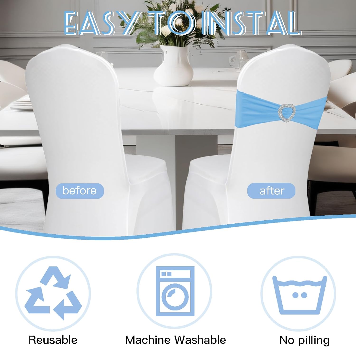 100 Pack Spandex Stretch Blue Chair Sashes Bows Universal Elastic Light Blue Chair Cover Bands Ties with Buckle Slider for Wedding Party Banquet Ceremony Reception Event Decorations