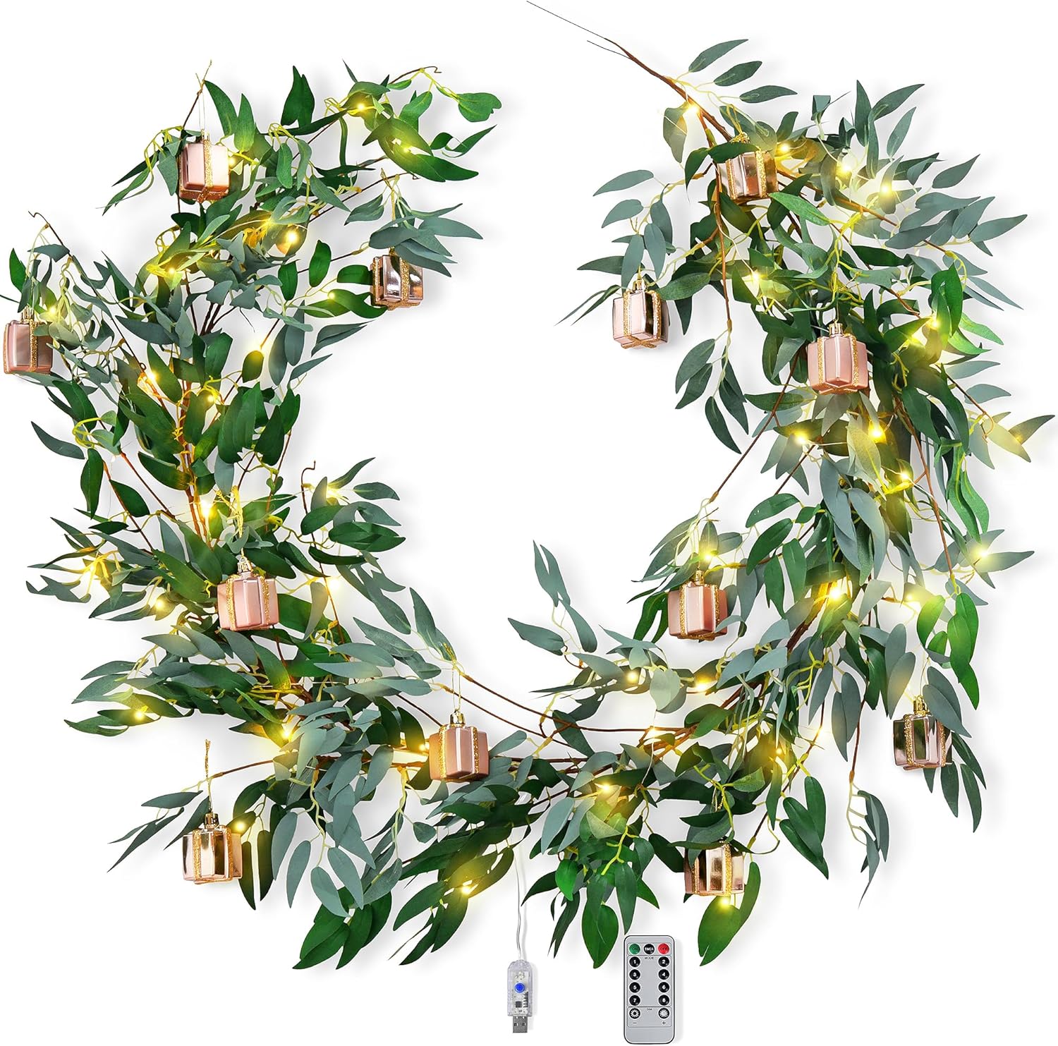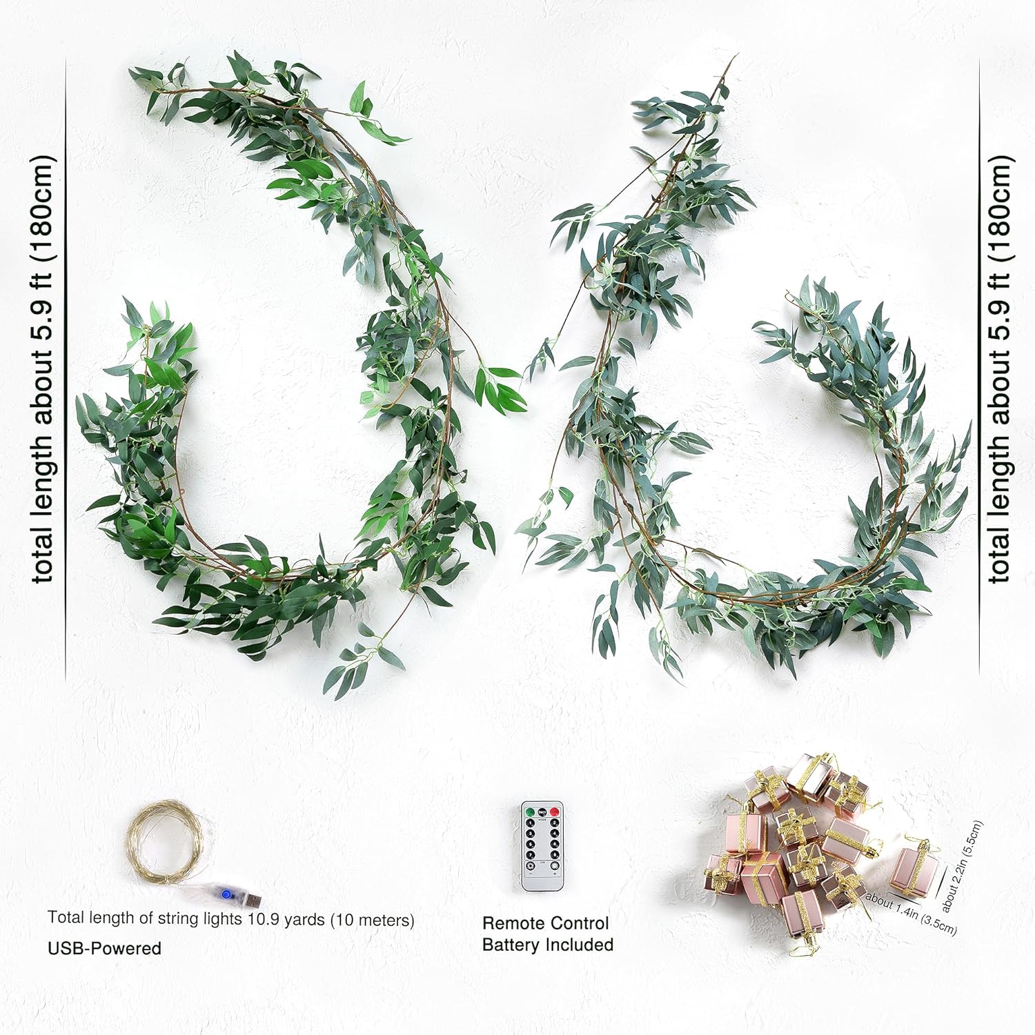 - Soft-touch eucalyptus greenery – Lifelike artificial eucalyptus leaves with a realistic shape and rich green color wind effortlessly around stair railings, window frames, headboards, and dining setups