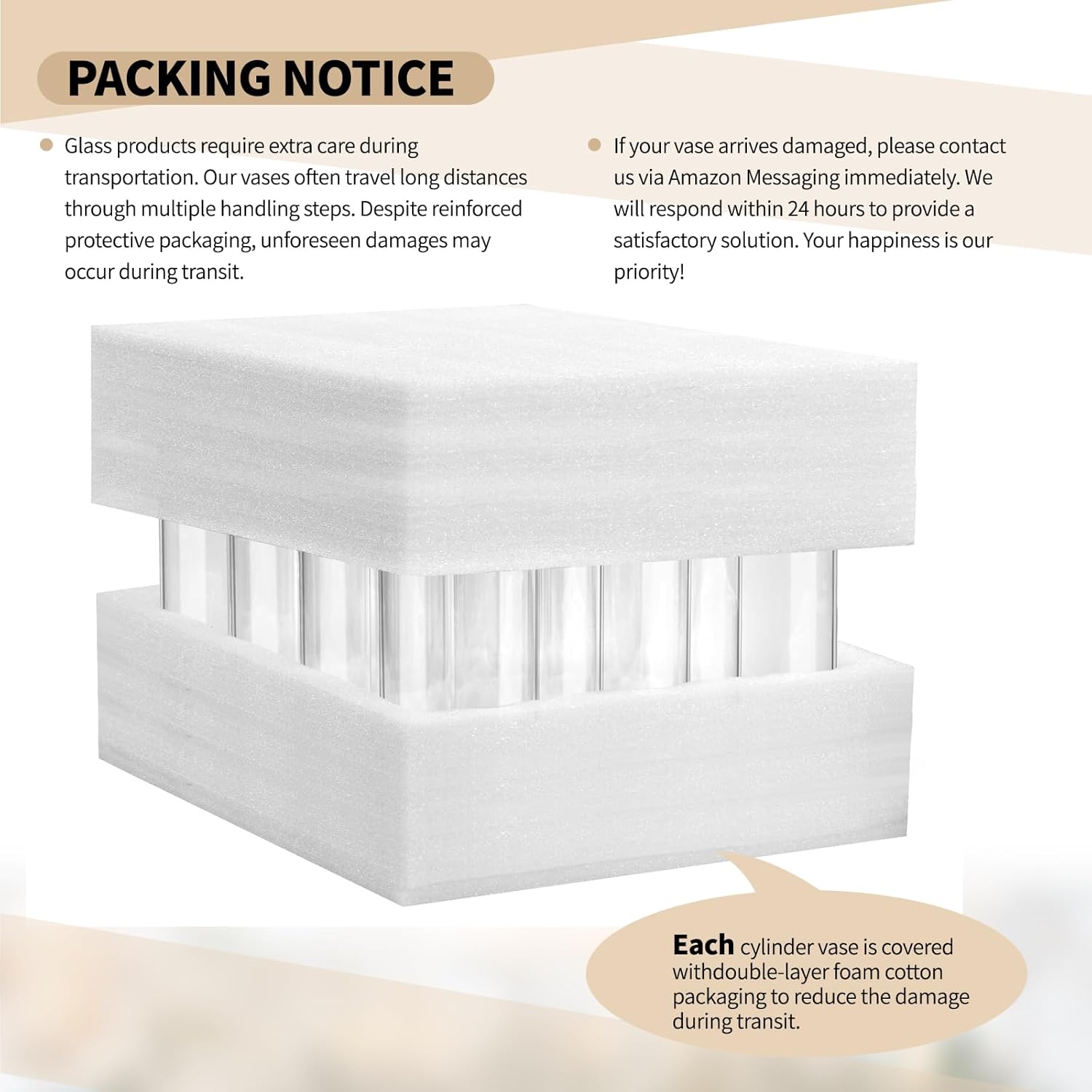 - ✅ Safe Package: Each glass cylinder vase arrives carefully protected with dual-layer foam cotton to prevent transit damage. But if anything arrives less than perfect? No worries. Just message us via Amazon—we’ll respond within 24 hours and make it right. Your happiness is our priority!