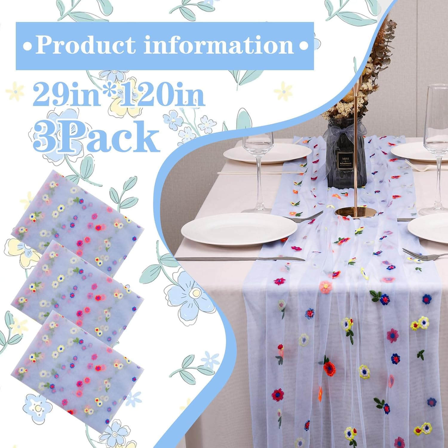 3PCS Blue Floral Table Runner 10 FT, Embroidery Daisy Table Runners Seasonal Sheer Tulle Table Runner for Thanksgiving Wedding Birthday Baby Shower Party