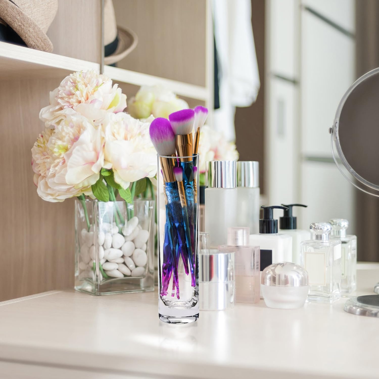- Widely used -- This cylinder glass vase can be filled fresh flowers, dried flowers, rose, floating candles, pillar candle, lighting decoration, or make up brushes storage, this clear flower vase also liquid filled & can be used for kinds of decors needs