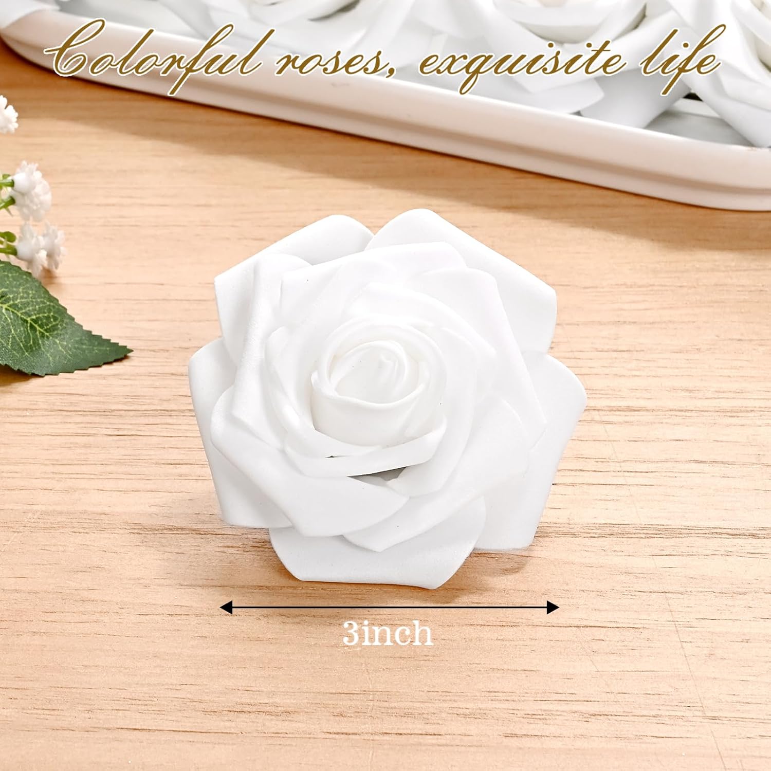 - Kindle Your Creative Flames: The box includes 36 white roses (3" flower head, 8" stem) and 8 green rose leaves, perfect for an array of DIY crafts. Whether creating wedding bouquets, graduation or birthday party ornaments, baby shower decorations, or cake adornments, our faux roses add a touch of class to every important moment.