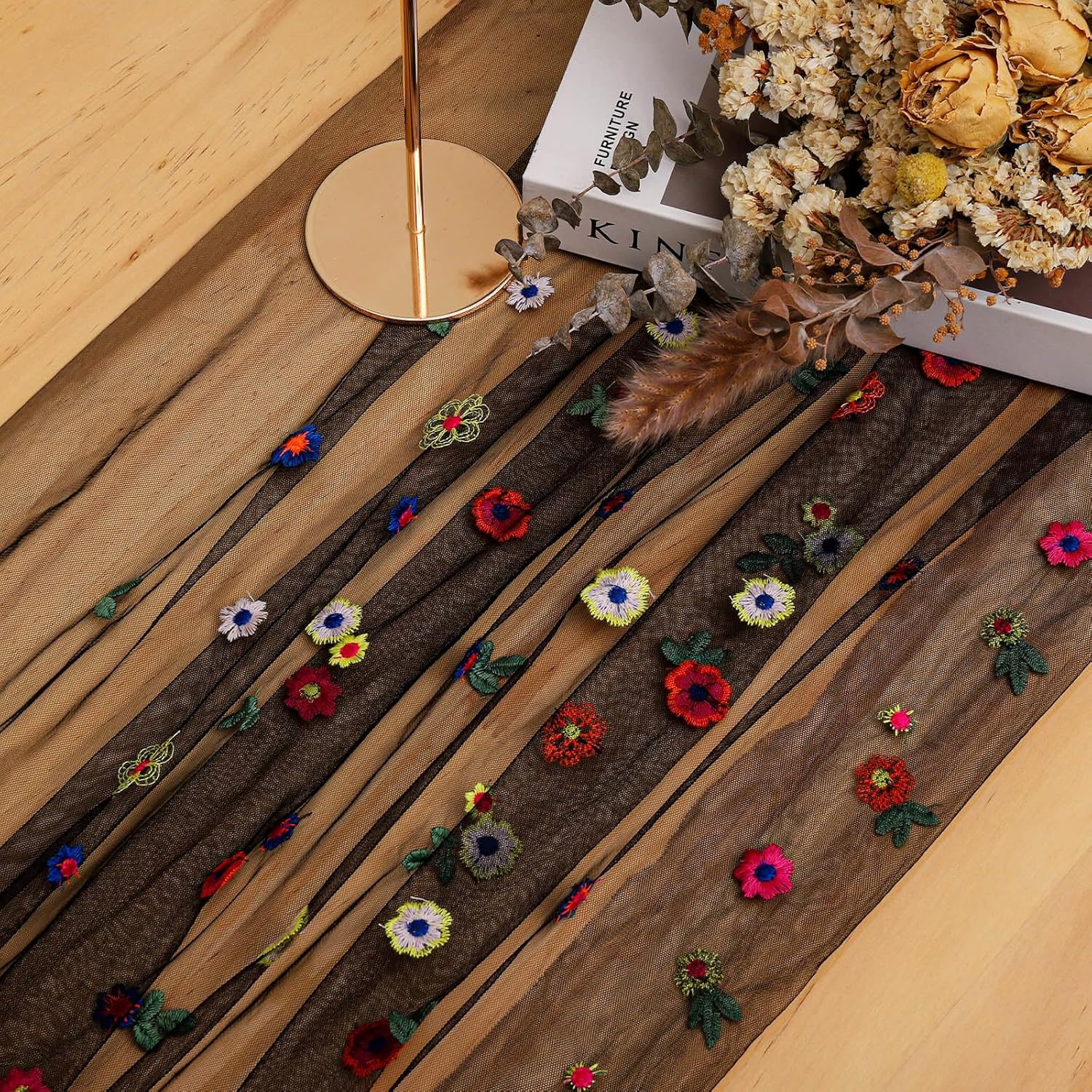 BINBE 12pcs Daisy Fall Table Runner Embroidery Gauze 10FT Florals Seasonal Tulle Holiday Birthday Kitchen Dining Table Decor for Home Party Black