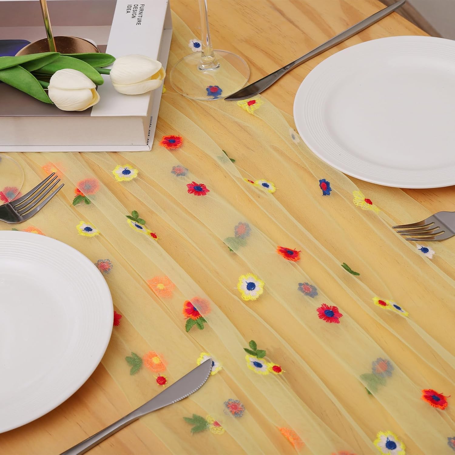BINBE 6pcs Daisy Fall Table Runner Embroidery Gauze 10FT Florals Seasonal Tulle Holiday Birthday Kitchen Dining Table Decor for Home Party Yellow