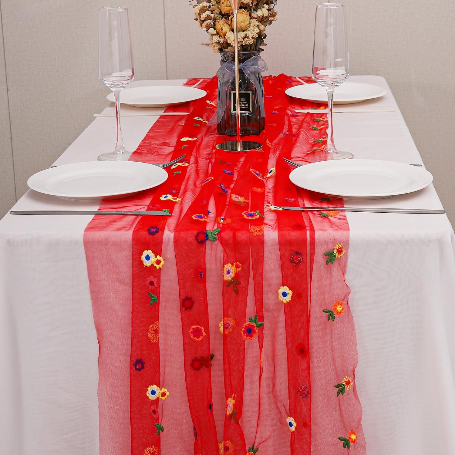 BINBE 12pcs Daisy Fall Table Runner Embroidery Gauze 10FT Florals Seasonal Tulle Holiday Birthday Kitchen Dining Table Decor for Home Party Red