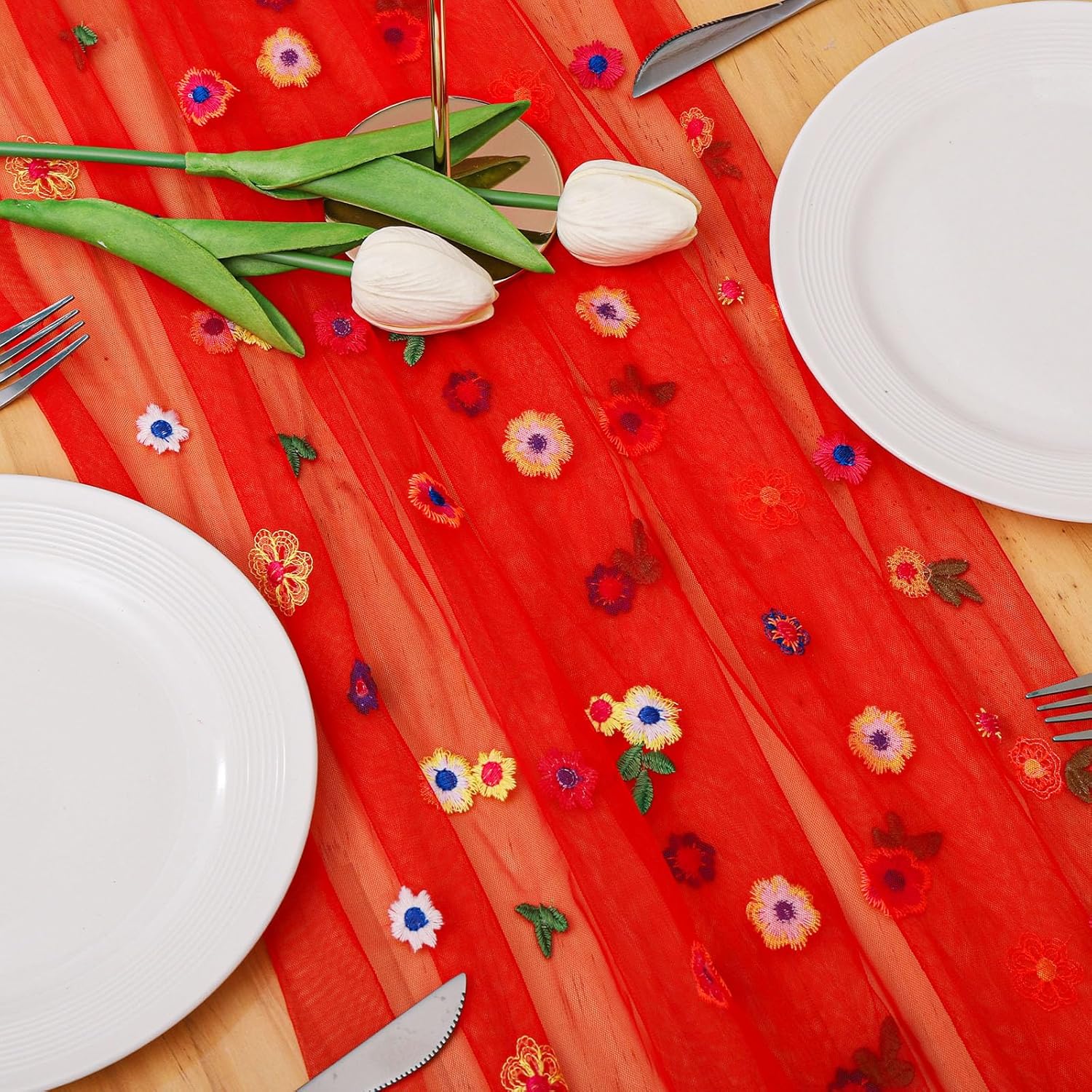 - High-Quality Tulle Fabric: Made from white chiffon fabric, this lightweight embroidered table runner is not only beautiful but also adds a touch of elegance to your dining experience. Each sheer floral table runner measures approximately 29 x 120 inches.