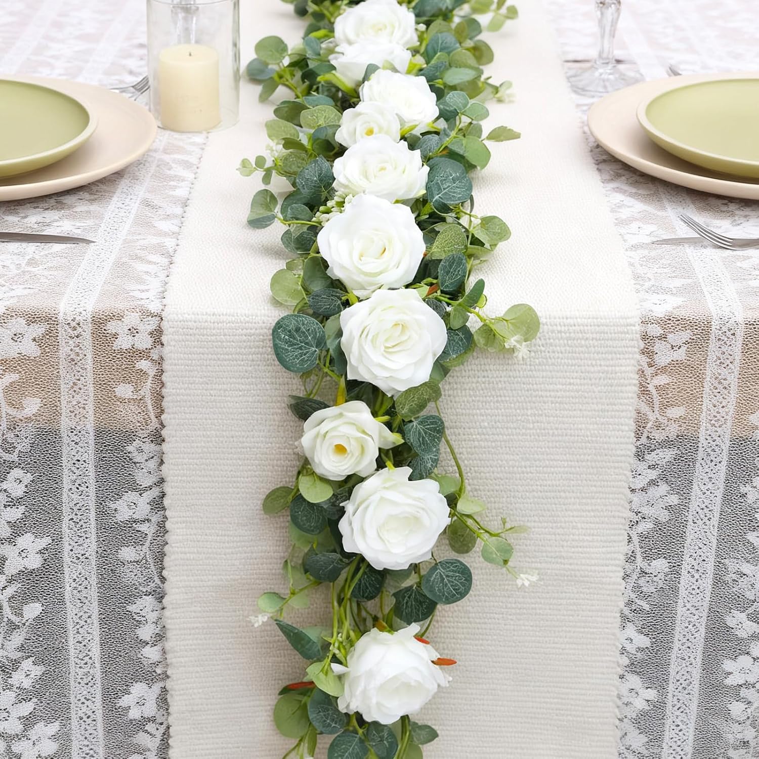 - 🌹PACKAGE DETAIL-Includes a garland with 14 white roses and lots of eucalyptus leaves. The length of the whole flower vine is about 180cm/6ft, size of the rose is about 10cm/3.94in, size of small rose is about 8cm/3.15in.